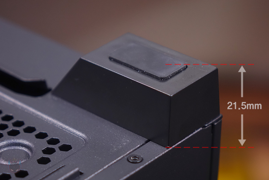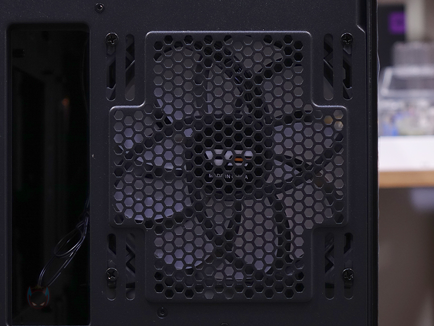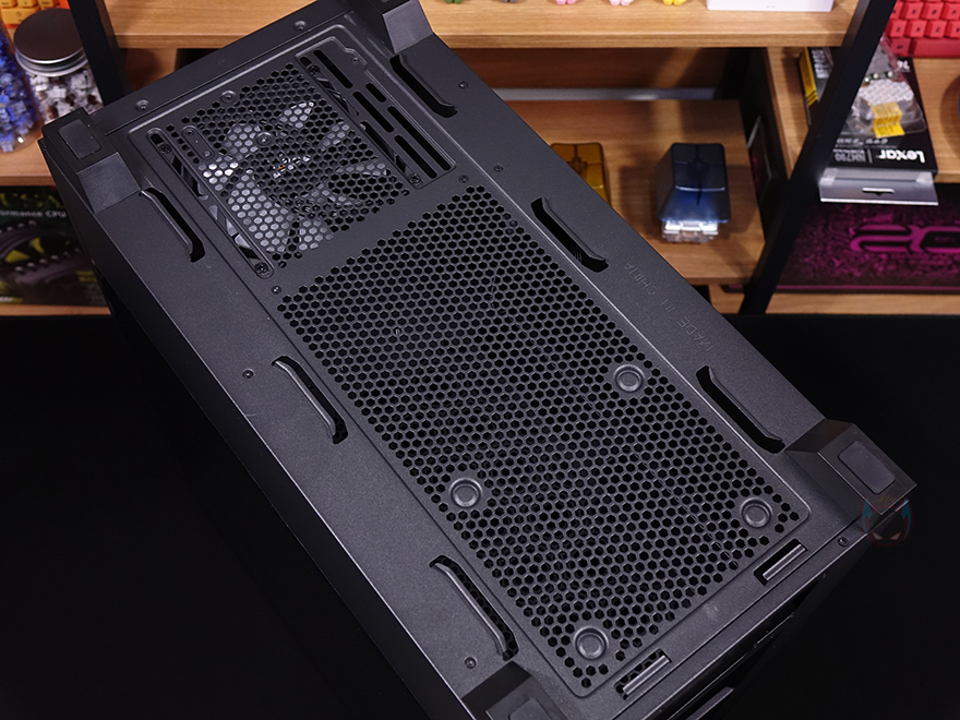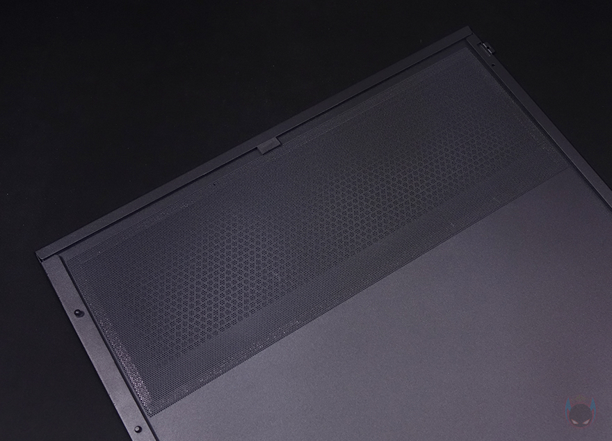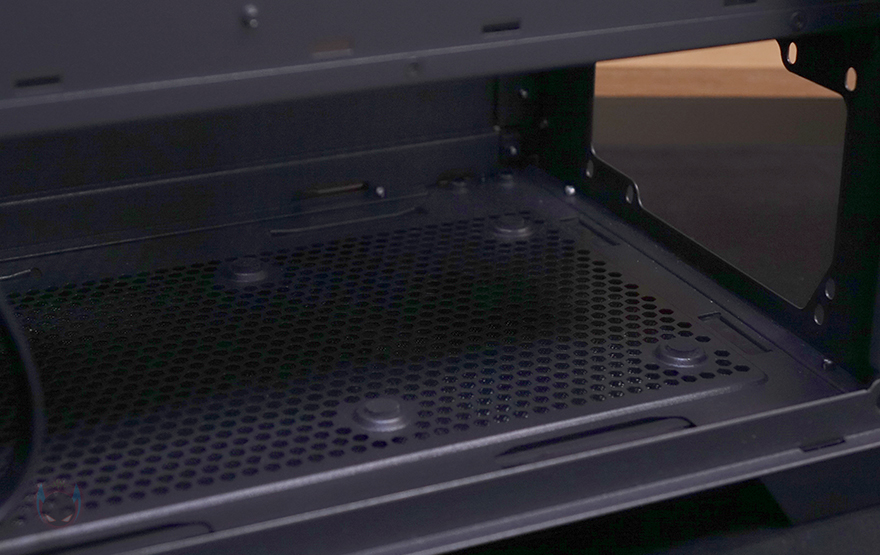 케이스 후면에는 후면 배기역할로 에어홀 처리와 함께 내부에 140mm 팬이 기본 장착된 것을 확인할 수 있으며, 팬 위치조절도 자유롭게 할 수 있게 나사홀을 길게 처리해놨습니다. 물론, 120mm 팬도 장착이 가능하죠. 그리고, 아래에 PCI슬롯은 미들타워 기준이 7개를 갖추고 있으며, 맨 아래 파워서플라이 자리에는 상하 방향 모두 장착이 가능하게 나사홀이 처리되어 있습니다. 외형 끝으로, 케이스 하단을 살펴보면, 하단 역시 상단처럼 전체 면적을 먼지필터로 장착했는데, 먼지 필터는 전면에서 슬라이딩 방식으로 쉽게 분리할 수 있습니다. 쉽게 말해, 케이스를 눕히지 않고 그냥 뺄 수 있는 거죠. 필터를 분리하면 하단 역시 쿨링효과를 위해 에어홀 처리가 된 것을 확인할 수 있으며, 앞부분에는 내부에서 다시 확인하겠지만, 하단 쿨링시스템으로 팬이 장착된 것을 간접적으로 먼저 확인할 수 있습니다. 참고로, 케이스 받침대는 약 21.5mm 높이를 가졌고, 패드도 기본 부착되어 있습니다.