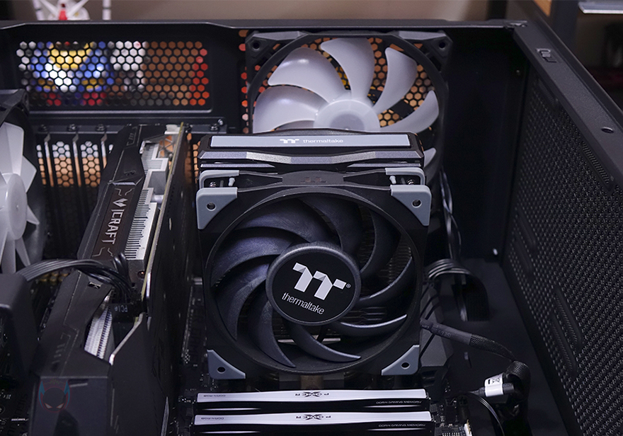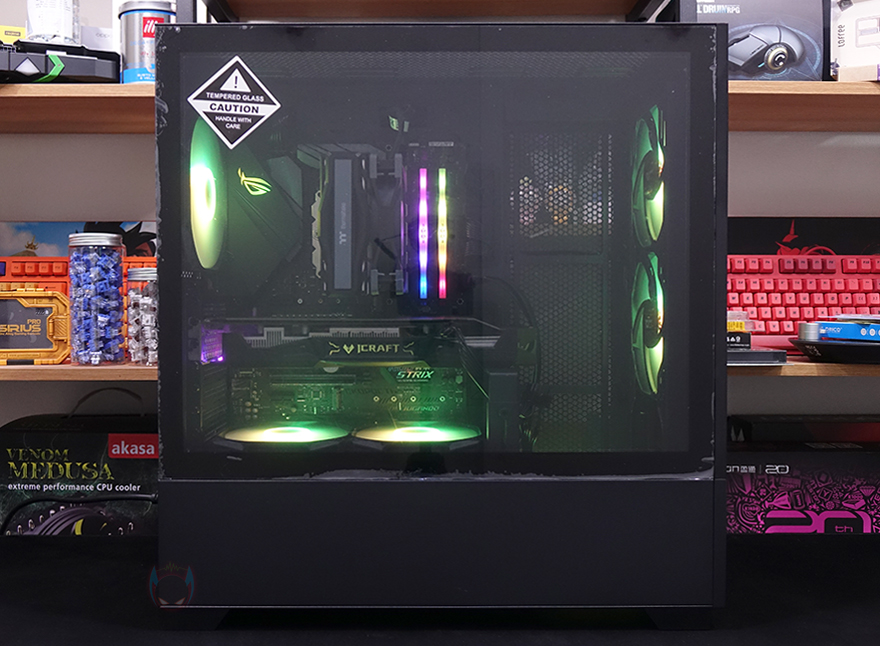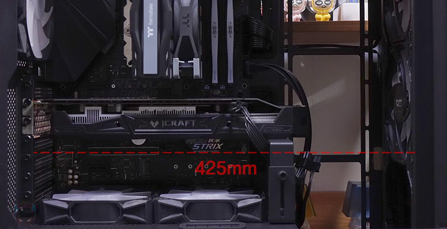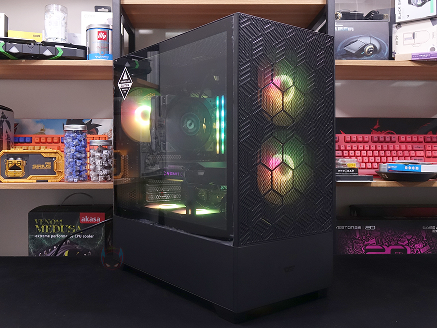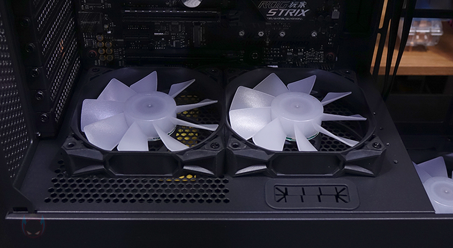 직접, 다크플래쉬 DF5000 MESH ARGB 강화유리 PC케이스를 사용해 시스템 조립을 해보면, 미들타워 규격보다는 좀 큰 편에 속하기 때문에 내부 공간이 넓은 편입니다. 그래서, 전반적으로 조립은 수월한 편이며, 간섭 발생도 적고, 케이블정리도 수월한 편이죠. 좀 더 자세히 살펴보면, CPU 쿨러 같은 경우에는 타워형 쿨러 기준으로 최대 180mm까지 지원하고 있어서, 시중에 판매되고 있는 대부분의 공랭쿨러는 장착이 가능합니다. 또한, 그래픽카드 같은 경우에도 최대 425mm 길이를 지원하고 있어서 역시 대부분의 그래픽카드 장착이 가능하고, 앞서 확인한 PSU 커버 상단에 리버스 팬을 추가로 장착하면 좀 더 그래픽카드 쿨링에 효과를 높일 수 있죠. 조립을 마치고 전원을 켜면 기본 장착된 전면 팬과 후면, 그리고 하단 팬까지 RGB 라이트닝효과를 볼 수 있으며, 모두 케이블로 서로 연결시켜서 작동하기 때문에 기본적으로 함께 연동 작동됩니다.