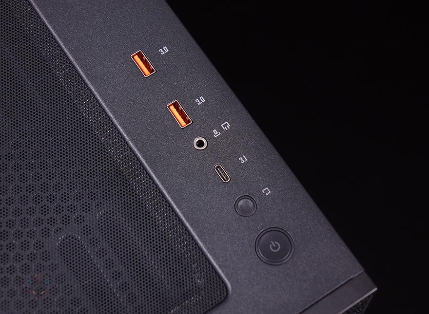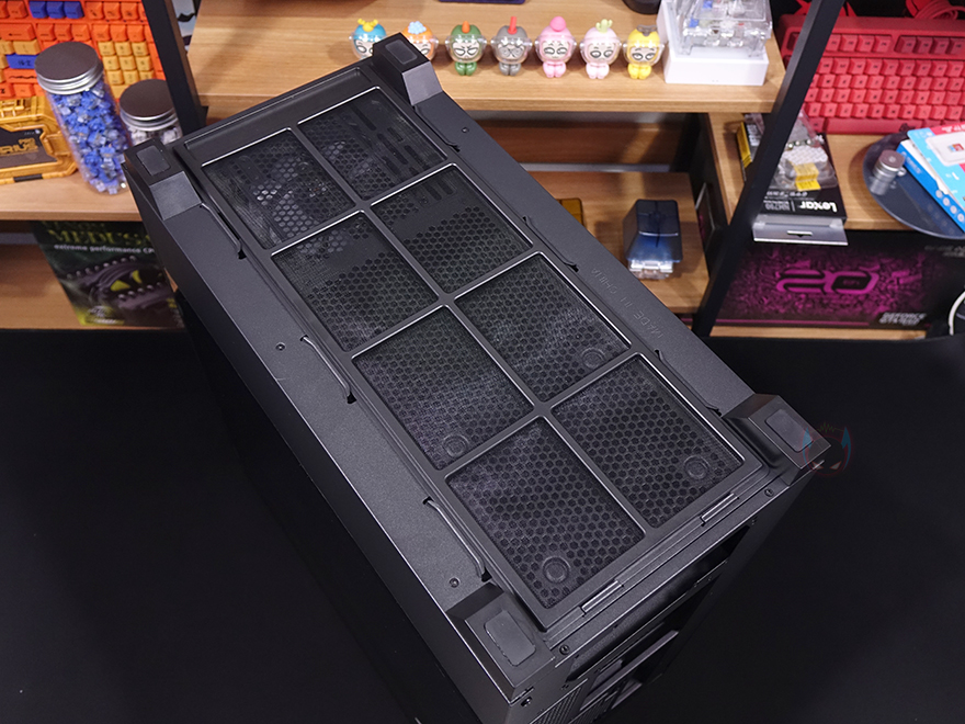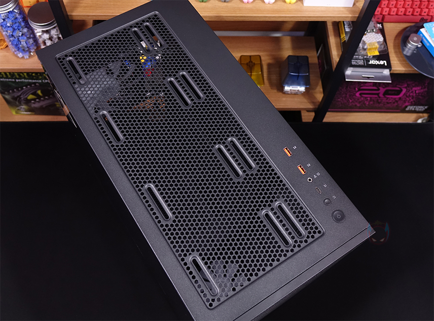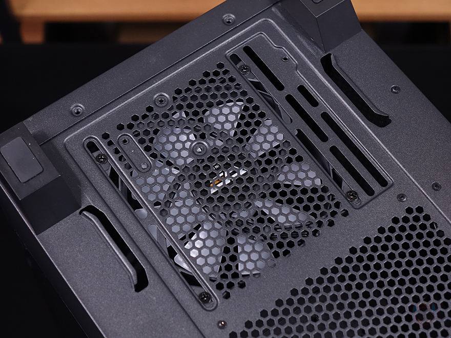 DF5000 케이스 상단에는 맨 오른쪽에 버튼과 포트가 배치되어 있는데, 맨 앞에 전원버튼, 리셋버튼, USB 타입C, 오디오/마이크 포트, USB 3.0 포트 2개 순으로 배치되어 있습니다. 그리고, 왼쪽으로 나머지 영역은 모두 상단 쿨링시스템을 갖출 수 있게 에어홀 처리와 함께 고무자석 패드를 사용한 먼지 필터가 장착되어 있습니다. 필터는 분리하면 에어홀 처리와 함께 팬과 수랭쿨러시 라디에이터를 장착할 수 있게 나사홀이 처리되어 있는데, 상단에는 팬을 장착할 경우 140mm 최대 2개, 120mm 최대 3개 장착이 가능하고, 수랭쿨러시 라디에이터는 최대 360mm까지 장착이 가능합니다.