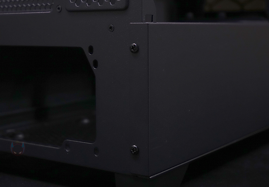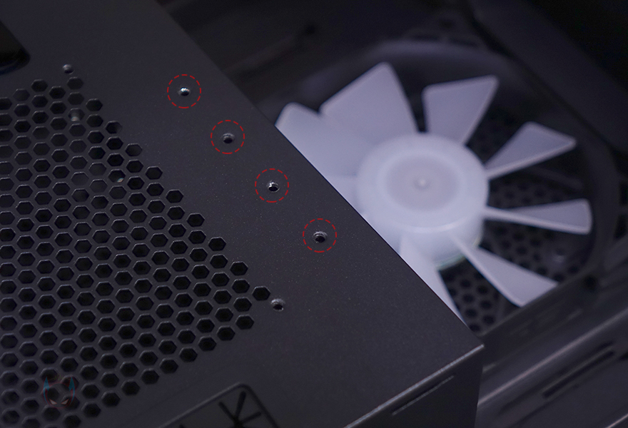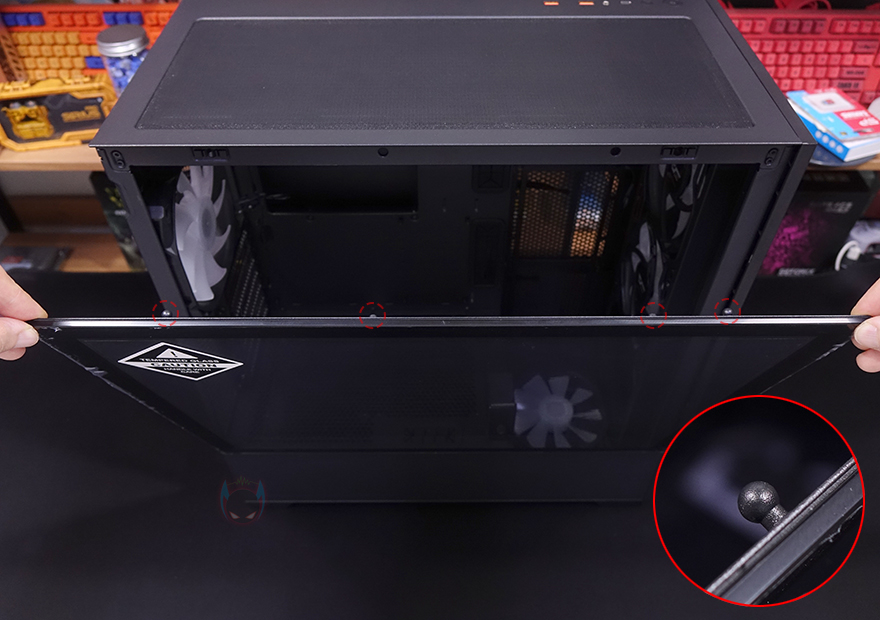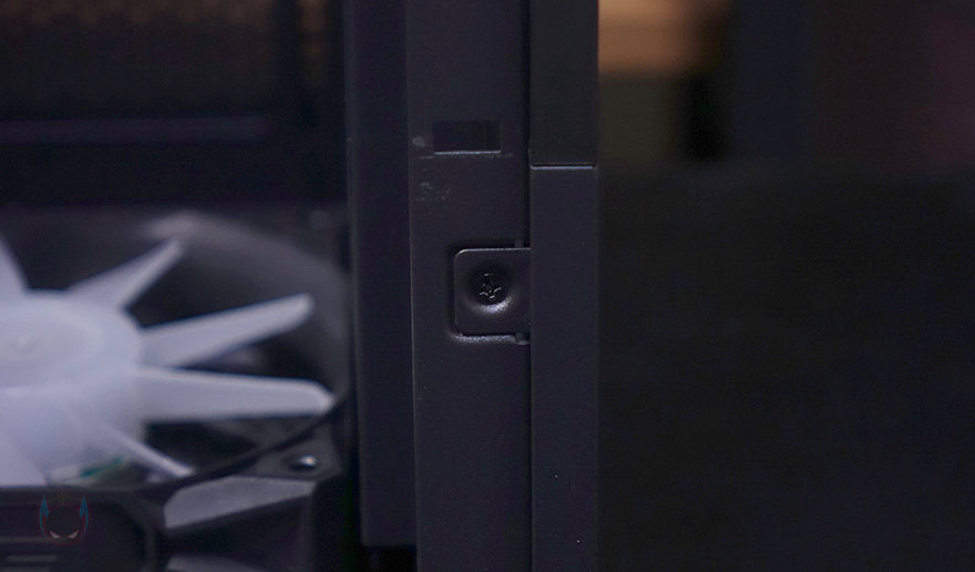 사이드 패널 같은경우에는 전면 기준 왼쪽 패널은 강화유리가 적용되어 있는데, 앞서 전면과 마찬가지로 2/3 영역까지 강화유리이고, 나머지 아랫부분은 샤시 패널입니다. 강화유리는 무나사 방식으로 공구 없이 쉽게 분리할 수 있는 볼-헤드 클램프 방식이며, 윗부분에서 당겨서 빼고 아랫부분 걸쇠를 살짝 들어서 빼면 되죠. 그리고, 아래 나머지 샤시 패널 부분도 후면에 고정된 나사 2개를 풀고, 슬라이드 방식으로 분리할 수 있습니다. 이렇게 샤시 패널을 분리하면 앞서 전면에서 확인한 전면 아래 샤시 커버 부분도 양쪽 측면에 고정된 나사를 풀고 분리할 수 있죠.