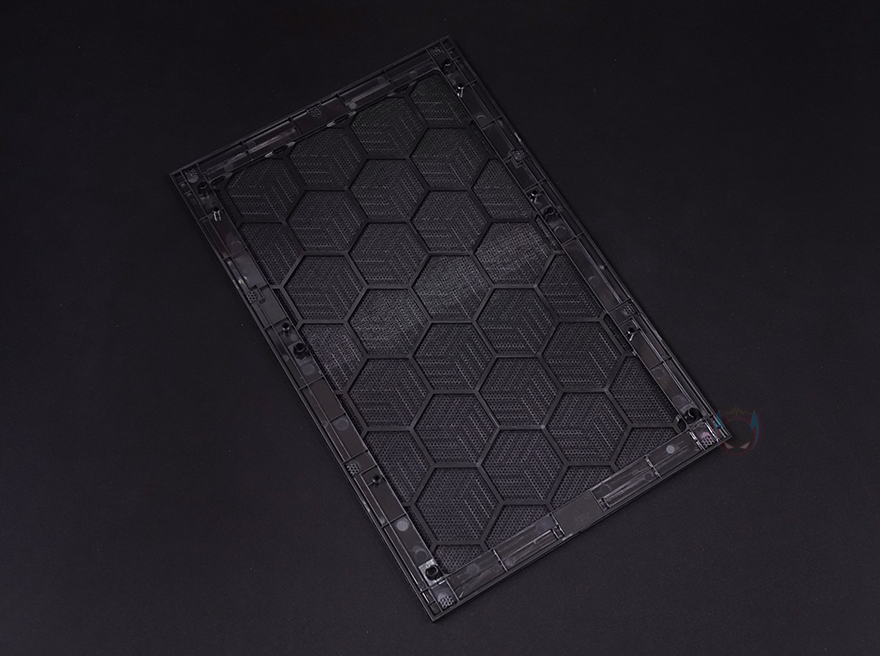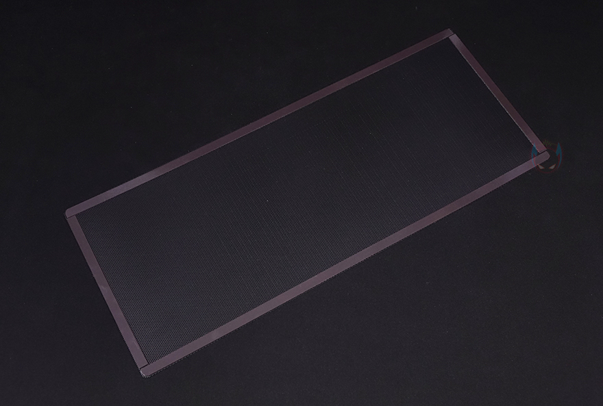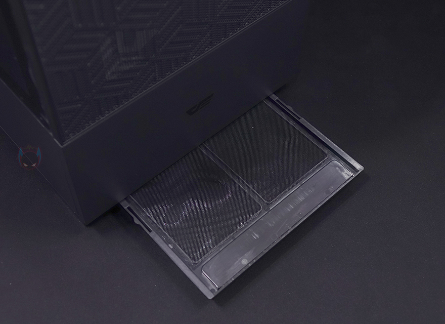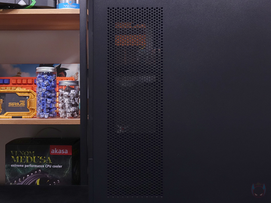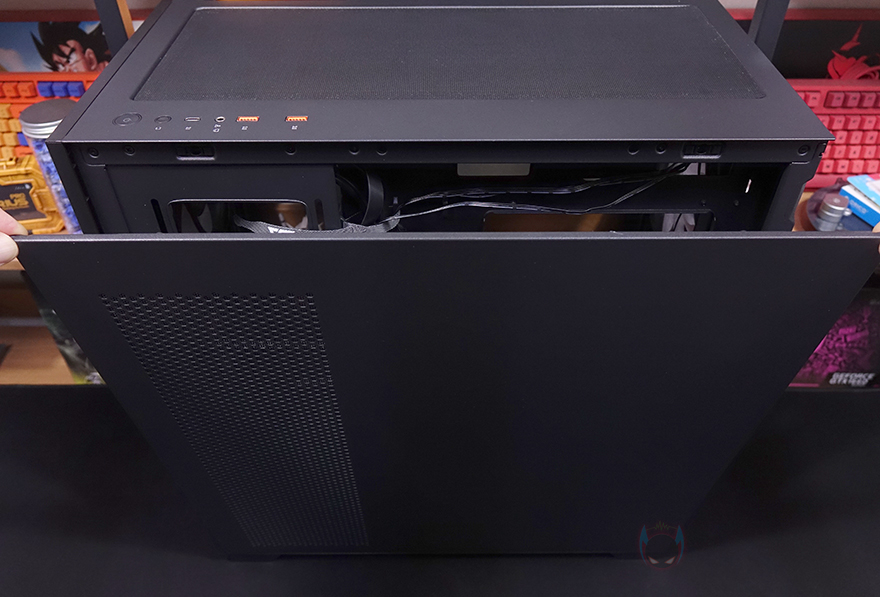 다시 잠깐 전면으로 돌아와서 전면 메쉬와 아래 샤시 커버까지 모두 분리하면 전면 내부에 팬을 장착하고 있는 브라켓도 고정나사를 풀면 분리가 가능합니다. 브라켓에는 총 140/120mm 팬 3개까지 장착이 가능하고, 수랭쿨러시 라디에이터도 최대 360mm까지 장착이 가능합니다. 또한, 브라켓 오른쪽 측면에는 케이블 정리를 할 수 있게 선-정리홀도 처리되어 있죠. 물론, 전면 베젤을 모두 분리하기 위해서 사이드 패널 일부를 분리해야 하는 점은 조금 불편하다 할 수 있습니다. 다시, 사이드패널로 돌아와서 전면 기준 오른쪽 패널은 민무늬 처리에 역시 무나사 방식의 볼-헤드 클램프를 적용하고 있으며, 앞부분은 내부 측면 쿨링효과를 위해 역시 에어홀 처리가 되어 있는데, 패널을 분리해 내부를 보면 역시 고무자석을 사용한 먼지 필터가 장착된 것을 확인할 수 있죠.