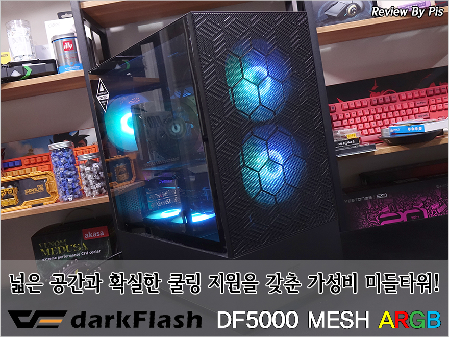 조립 PC를 구상할 때 가성비로 선택해야겠다 많이 생각하는 부품 중 하나가 바로 PC케이스죠. 그래서, 요즘 PC케이스 시장에서는 가성비 제품들이 많이 나오는데, PC케이스에서 가성비하면 대표적인 브랜드가 다로 다크플래쉬(darkFlash)입니다. 중국 Aigo의 글로벌버전 브랜드인 다크플래쉬는 국내시장에서도 가성비로 제대로 자리 잡아 꾸준히 그 행보를 보여주고 있죠. 다크플래쉬는 미니타워부터 미들타워까지 가성비 제품들이 넓게 분포하고 있는데, 오늘 만나볼 제품 역시 미들타워 제품으로썬 가성비로 나온 모델입니다. 바로, DF5000 MESH ARGB 강화유리 PC케이스입니다. 그럼, 다크플래쉬의 DF5000 MESH ARGB 강화유리(이하 DF5000) PC케이스를 한 번 살펴보도록 하죠.