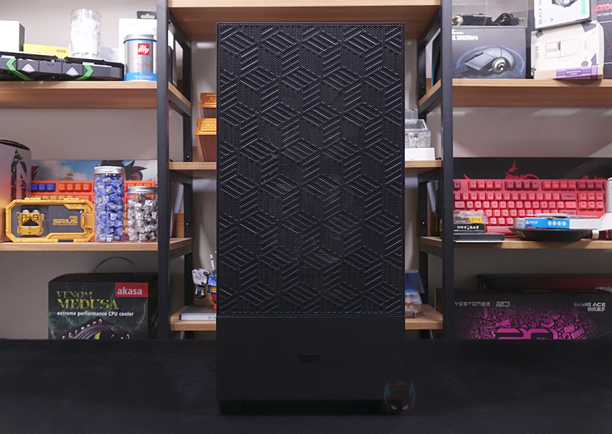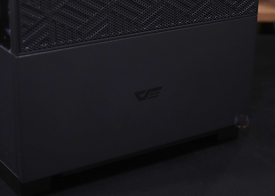 그럼, 본격적으로 다크플래쉬 DF5000 MESH ARGB 강화유리 PC케이스를 살펴보는데, 일단 색상은 블랙과 화이트 2가지 색상으로 출시되었으며, 외형부터 살펴보면 전면 베젤의 2/3는 메쉬 디자인으로 일반적인 단순 민무늬가 아닌 일정 패턴 윤곽의 디자인으로 적용되어 있습니다. 그리고, 나머지 아랫부분은 샤시부분으로 심플하게 로고만 새겨놨죠. 물론, 메쉬 부분은 외부에서 바로 분리가 됩니다. 메쉬를 분리하면 내부에는 전면 쿨링시스템으로 140mm 팬이 기본 2개 장착된 것을 확인할 수 있으며, 모두 ARGB 팬이죠. 참고로, 아래 샤시 커버 부분도 분리가 가능한데, 이 부분은 뒤에서 다시 언급하고, 분리된 메쉬 안쪽에는 먼지필터도 함께 적용된 것을 확인할 수 있습니다.