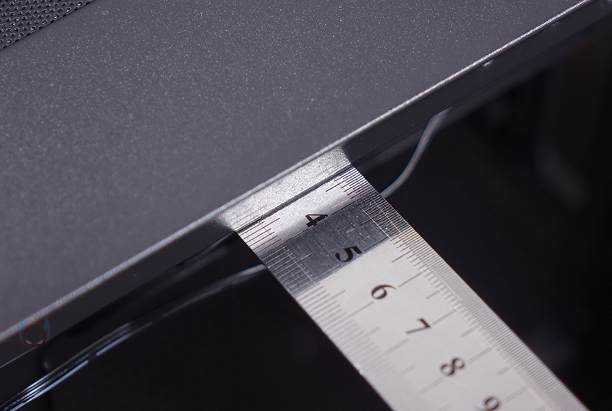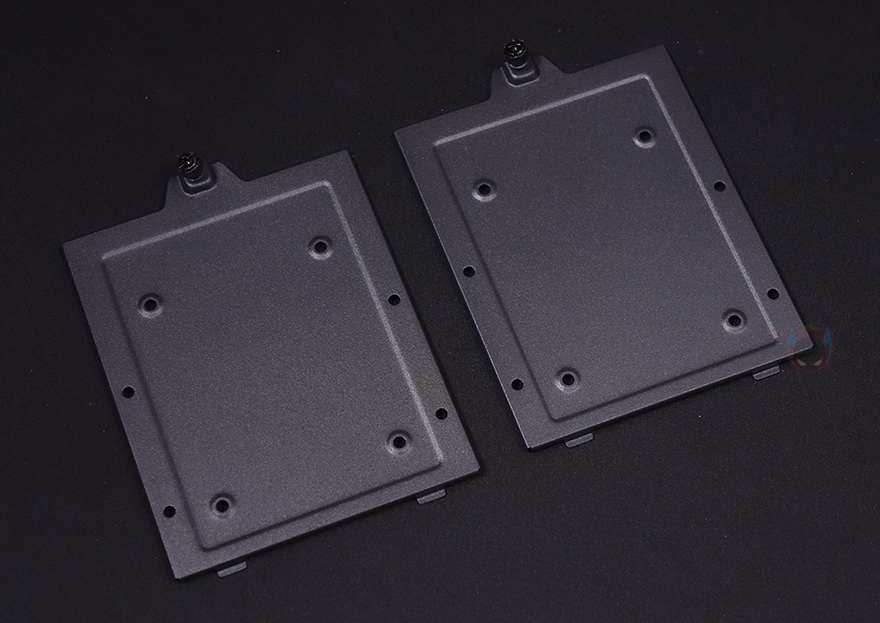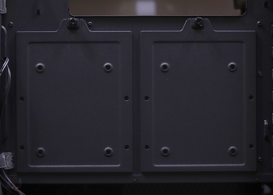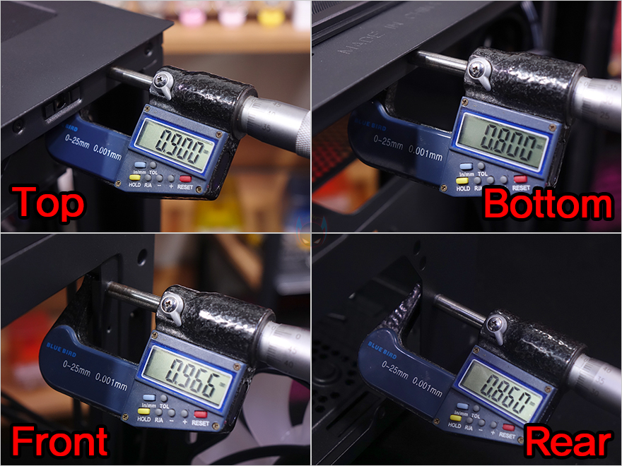 메인보드 트레이 후면 공간은 의외로 단조로운 편입니다. 일단, 후면 선정리 공간이기도한데 깊이는 약 30mm가 넘어서 충분히 케이블 정리를 하기에 수월한 공간이며, 기본 케이블들도 벨크로타이를 사용해 기본 정리되어 있죠. 그리고, CPU-cut-Out 아래에는 2개의 저장장치 브라켓이 장착되어 있는데, 손나사로 풀면 쉽게 분리가 되고, 브라켓에는 3.5인치 HDD나 2.5인치 SSD/HDD를 장착할 수 있습니다. 브라켓이 2개이니 최대 2개까지 장착이 가능한 거죠. 그리고, 아래 파워서플라이가 장착되는 공간에는 샤시 자체에 기본 받침대 처리와 함께 패드가 기본 부착된 것을 확인할 수 있습니다. 끝으로, DF5000 케이스에 사용된 샤시의 두께를 부위별로 측정해 보면, 0.8~0.9mm대로 0.8T 샤시가 사용되었음을 짐작할 수 있죠.