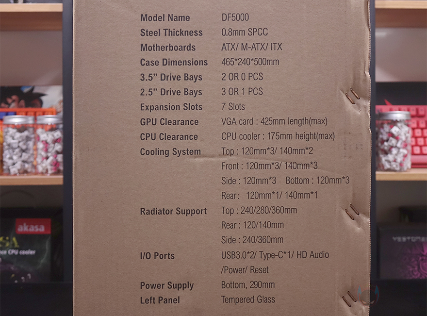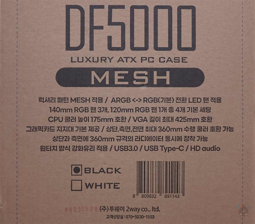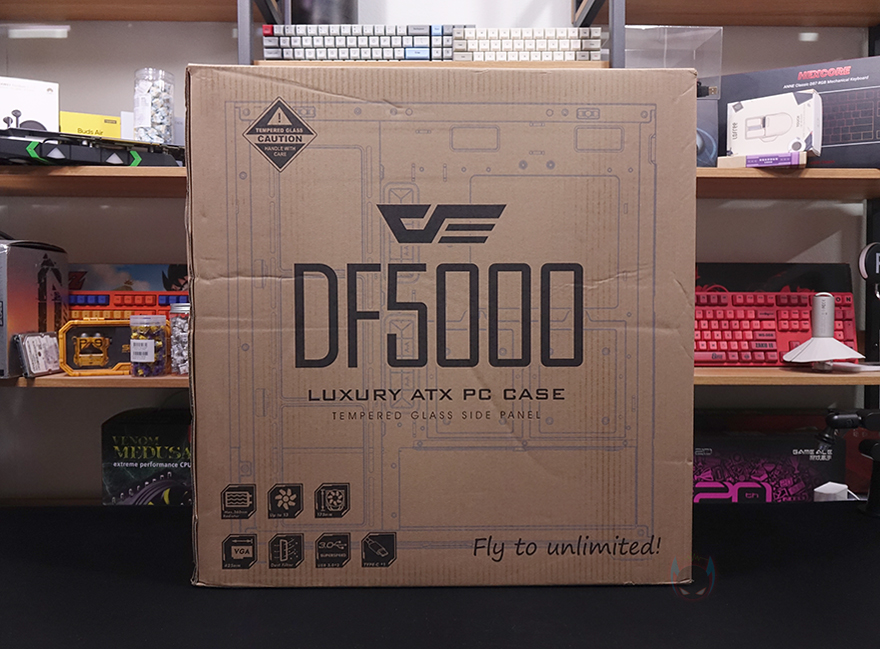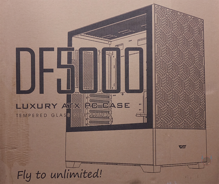 제품박스부터 살펴보면, 전후면에는 큼지막한 DF5000 모델명과 함께 한쪽은 배경으로 제품 이미지를, 나머지 한쪽은 내부 구조 이미지를 담고 있습니다. 모델명과 함께 콘셉트 문구에 럭셔리라는 문구를 확인할 수 있고, 주요 특징으로 그래픽카드 길이 지원, 팬, 쿨링팬, 먼지 필터, USB 포트 지원을 표기해놨는데, 그래픽카드와 쿨러 길이 지원만 보면 이 제품이 미들타워에서도 좀 큰 편이라는 걸 짐작할 수 있죠. 그리고, 양쪽 측면에는 각각 주요 특징과 기본 사양을 표기해 놨는데, 둘 다 상세하게 표기하고 있어서 소비자입장에선 구입 전 충분히 정보를 얻을 수 있겠습니다.