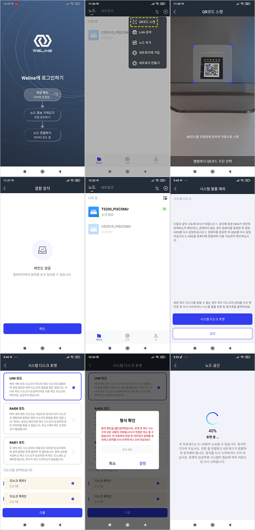 직접, 오리코(ORICO) MetaCube를 사용해 보면, 일단 리뷰에 사용된 모델은 2베이의 TS200이라 여기에 맞춰 2개의 HDD를 장착해서 사용했고, 전원과 이더넷케이블, 저장장치까지 모두 정상적으로 인식되면, 전면에 배치된 4개의 LED 인디케이터(Indicator)가 블루(Blue) 색상으로 점등되는 것 확인할 수 있습니다. 그리고, 앞서 언급했듯이 MetaCube도 앞서 만난 CD3510 외장 케이스처럼 저장장치 운영체제는 Weline OS를 사용합니다. 그래서, MetaCube 기본설정을 할 때는 윈도우 운영체제 지원의 Weline보다는 안드로이드 같은 모바일기반에서 사용할 수 있는 Weline을 사용하는 게 편합니다. 왜냐하면, 모바일버전에선 한국어가 지원되기 때문이죠. MetaCube 기본설정은 간단합니다. 모바일버전의 Weline App을 다운로드하여 설치한 후, 계정을 만들고 로그인을 합니다. 그리고, 노드화면 맨 상단 오른쪽에 +를 선택하면 QR코드 스캔을 선택해서, 앞서 외형에서 확인한 상단에 배치된 QR코드를 스캔해 주면, TS200 모델 장치가 인식됩니다. 물론, 장치이름은 언제든지 변경할 수 있습니다. 그다음으로 장치를 선택한 후 포맷과정이 나오는데, 먼저 디스크 모드 선택에선 TS200 모델 같은 경우 LVM, RAID 0, RAID 1 3가지 모드 중 선택할 수 있으며, 모드를 선택하고 다음으로 넘어가면 형식 지원 입력란에 안내에 따라 입력란에 '형식 지원'이라고 입력하고 넘어가면, 자동으로 포맷이 진행되고 기본설정이 마무리됩니다.