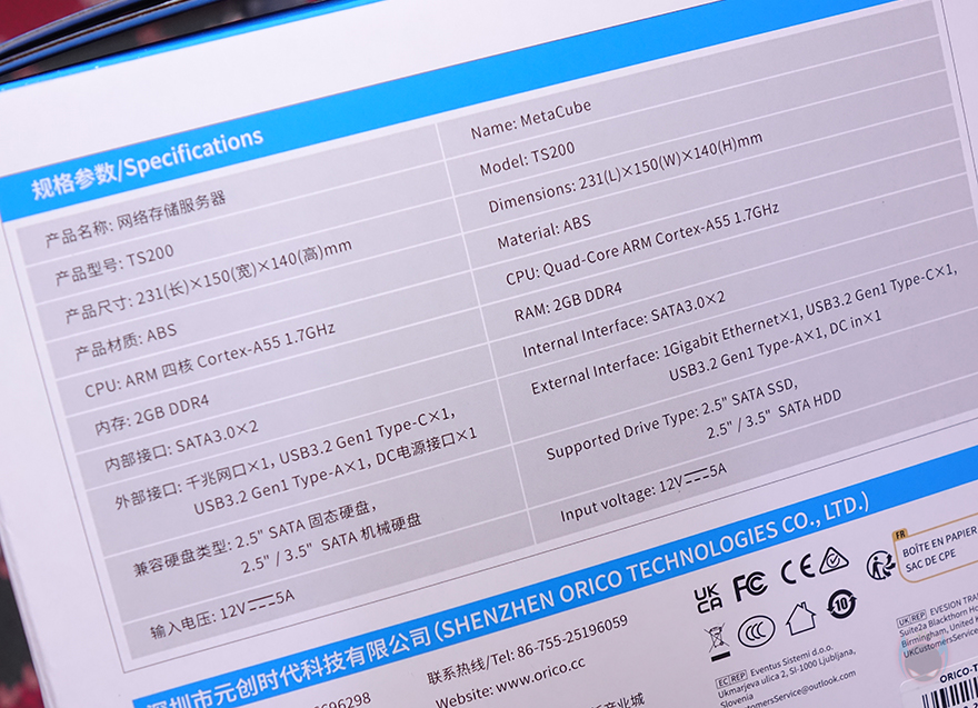 제품박스부터 살펴보면, 뒤에서도 확인하겠지만 MetaCube는 2가지 모델로 출시되었습니다. 쉽게 말해, 2베이(Bay)와 5베이로 나왔는데, 리뷰에서 살펴볼 모델은 2베이 모델인 TS200으로 제품 박스 전면에 제품이름과 함께 제품 이미지를 담고 있어서 쉽게 2베이가 무슨 의미인지 알 수 있고, 크기가 작다란 것도 짐작할 수 있죠. 물론, 2베이 모델은 TS200이고, 모델명 아래에 간략하게 제품 콘셉트 문구도 표기해 놨습니다. 참고로, 한쪽에는 영문으로 반대쪽에는 중국어로 표기해 놨습니다.