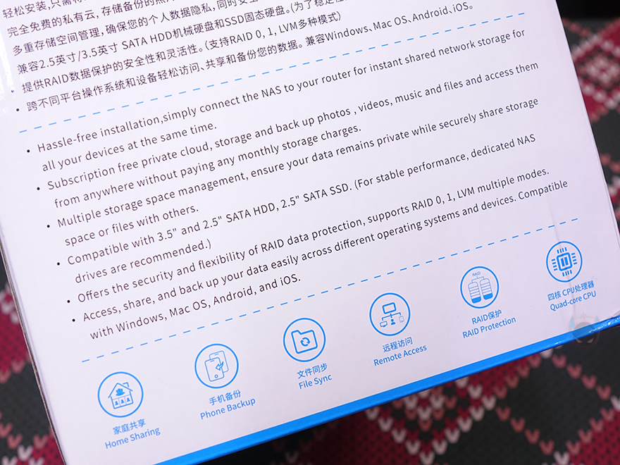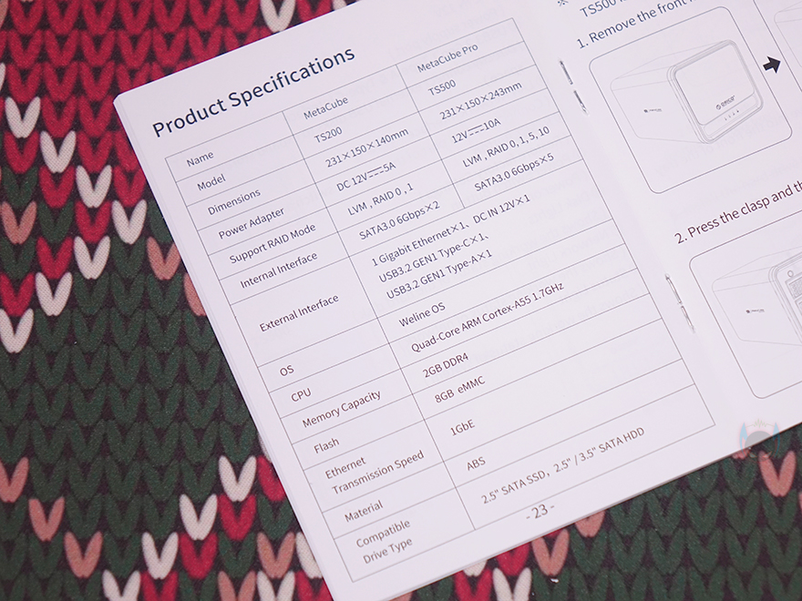 그리고, 박스 양쪽 측면에는 각각 제품의 주요 특징과 기본 사양을 표기해 놨는데, 모두 영어와 중국어 함께 표기해 놨으며, 주요 특징에는 홈 공유(Home Sharing), 모바일 백업(Phone Backup), 파일 연동(File Sync), 원격 접근(Remote Access), RAID 보호, 쿼드 코어 CPU 사양, 2.5/3.5인치 저장장치 지원, 다양한 운영체제(OS) 호환성 등을 언급해놨습니다. 또한, 사양 표기에는 2베이의 TS200 모델 기준으로 표기해놨으며, 박스 상단에는 구입 시 이동 편의성을 위해 손잡이도 적용되어 있습니다. 박스를 열어보면, 외부 충격방지를 위해 우레탄-폼과 비닐 포장처리를 확인할 수 있으며, 부속품들은 별도의 박스에 보관 제공됩니다. 제품 구성에는 MetaCube, 전원어댑터 및 케이블, 이더넷케이블, HDD/SSD 장착에 사용되는 나사, 공구 드라이버, 제품 설명서로 이루어져 있는데, 설명서에는 추가로 5베이 모델 TS500의 사양 정보도 담고 있습니다.