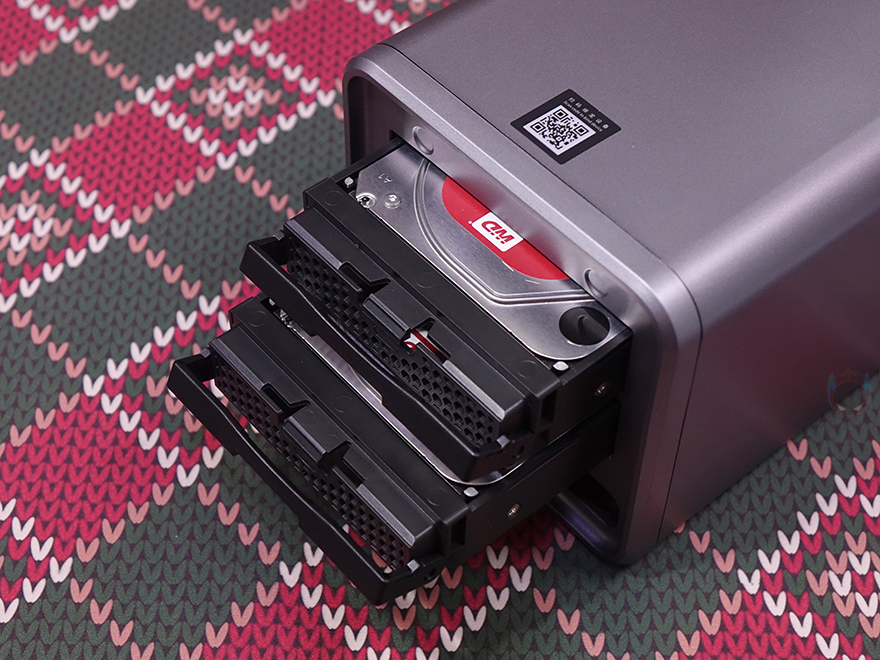 그래서, 리뷰에선 2베이인 TS200 모델을 기준으로 살펴보는데, 아담한 사이즈에 전면에는 베이를 가릴 수 있는 커버가 장착되어 있으며, 손쉽게 탈부착이 가능하도록 자석방식(magnetic)을 적용했습니다. 커버 안쪽에는 NAS 운영체제로 사용되는 Weline 프로그램 다운로드 QR코드를 표기해 놨죠. 커버를 분리하면 2개의 저장장치를 장착할 수 있는 베이를 확인할 수 있는데, 베이 분리도 간단합니다. 걸쇠 부분을 살짝 누른 후 레버가 풀리면서 앞으로 당기면 쉽게 분리되죠. 당연히 베이에는 3.5인치 HDD 또는 2.5인치 HDD/SSD를 제공되는 나사를 사용해 장착해 주면 됩니다. 그리고, 전면 아래에는 저장장치와 이더넷 케이블 연결 상태 등 작동상태를 확인할 수 있는 LED 인디케이터(Indicator)가 적용되어 있는데, 개봉 시에는 보호비닐이 부착되어 있습니다.
