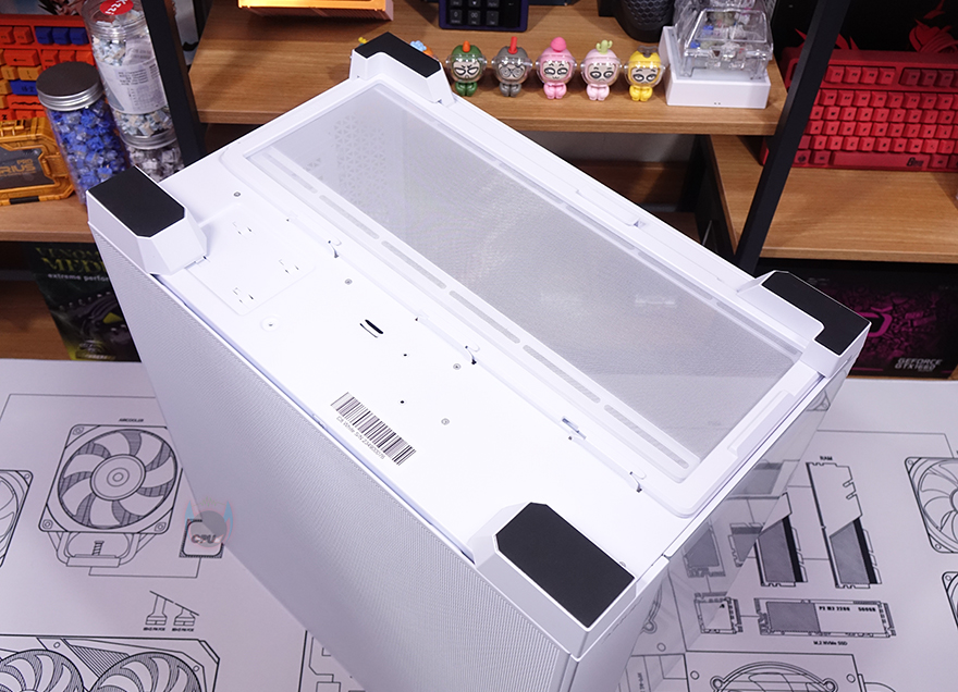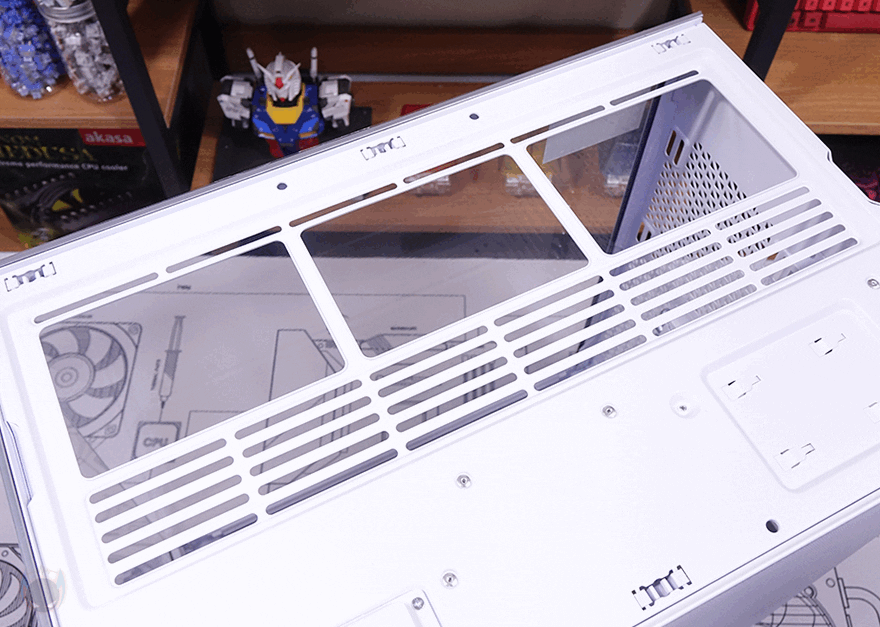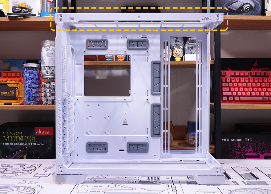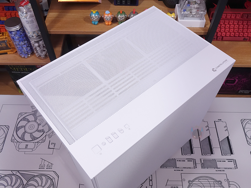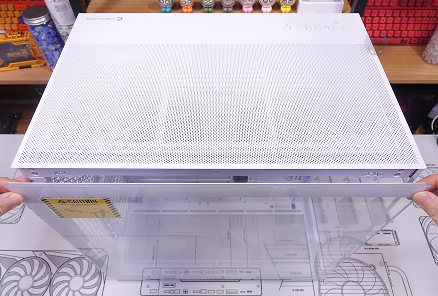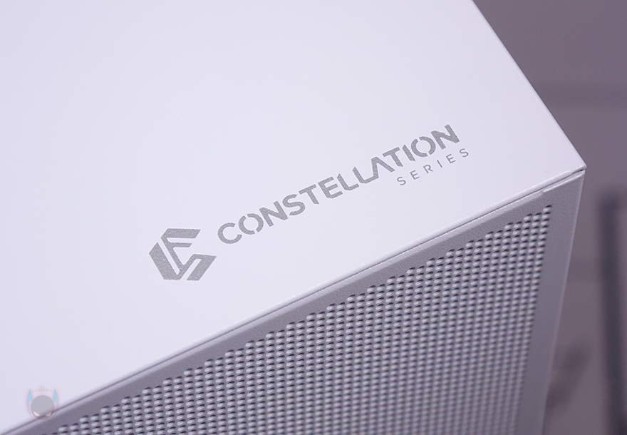 C8 케이스 상단에는 맨 오른쪽 일부를 민무늬 처리와 함께 앞부분에 버튼 및 포트를 배치해 놨는데, 앞부분부터 전원 버튼, EAR/MIC 포트, USB 3.0 포트 2개, USB 타입C 포트 1개, 리셋 버튼순으로 적용했습니다. 특히, 포트들은 모두 기본적으로 케이스 색상에 맞춰 커버를 적용하고 있어서 사용하지 않을 시 먼지 유입 및 부식 방지를 할 수 있고, 커버를 벗겨서 포트 안쪽을 보면 접촉부분도 화이트 색상으로 깔맞춤 해놨습니다. 그리고, 같은 위치로 맨 뒷부분에는 Constellation 시리즈 표기를 해놨습니다. 또한, 맨 오른쪽을 제외한 나머지 부분들은 오른쪽 사이드 패널과 동일하게 작은 에어홀의 메쉬 디자인을 적용했으며, 상단 베젤 역시 후면에 분리-홈을 통해 위로 밀어 올리면서 쉽게 분리할 수 있습니다. 물론, 상단 베젤 안쪽에도 볼헤드-핀을 확인할 수 있는데 역시 오른쪽 사이드 패널과 마찬가지로 작은 헤드를 적용했습니다. 그리고, 패널은 분리하면 내부 상단에 쿨링시스템을 갖출 수 있게 큼지막한 에어홀 처리와 긴 나사홀 처리를 확인할 수 있는데, 팬(FAN) 같은 경우 최대 160mm 팬까지 장착이 가능하고, 160mm 기준으로는 최대 2개, 140mm와 120mm 팬은 최대 3개까지 장착할 수 있습니다. 참고로, 수랭쿨러시 라디에이터 장착은 최대 360mm까지 장착할 수 있죠.