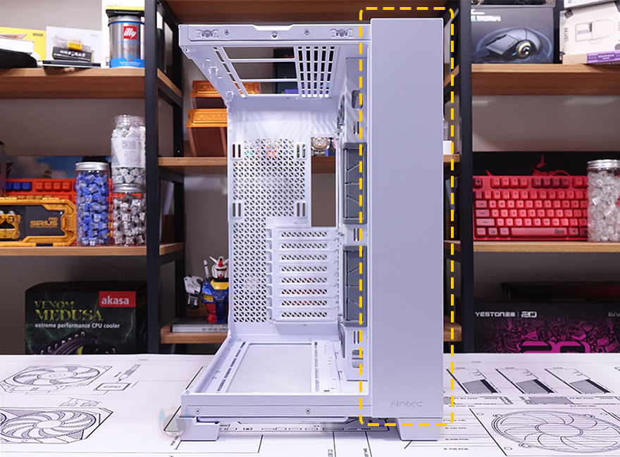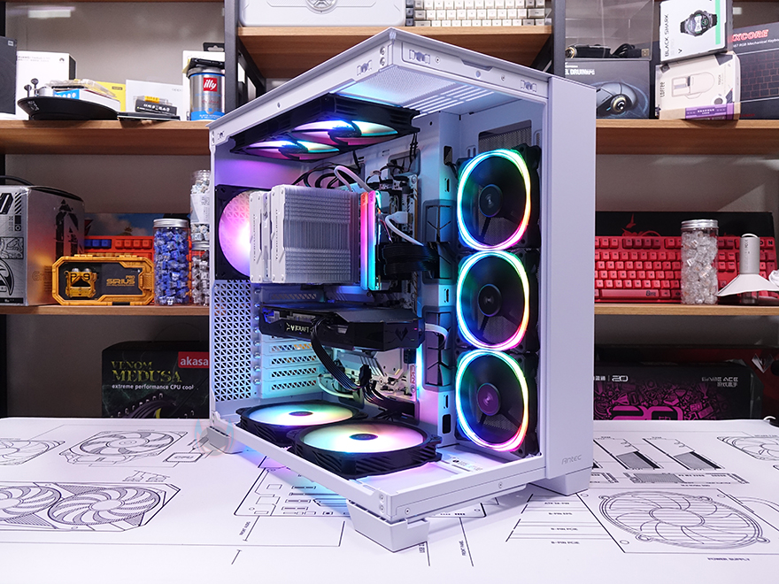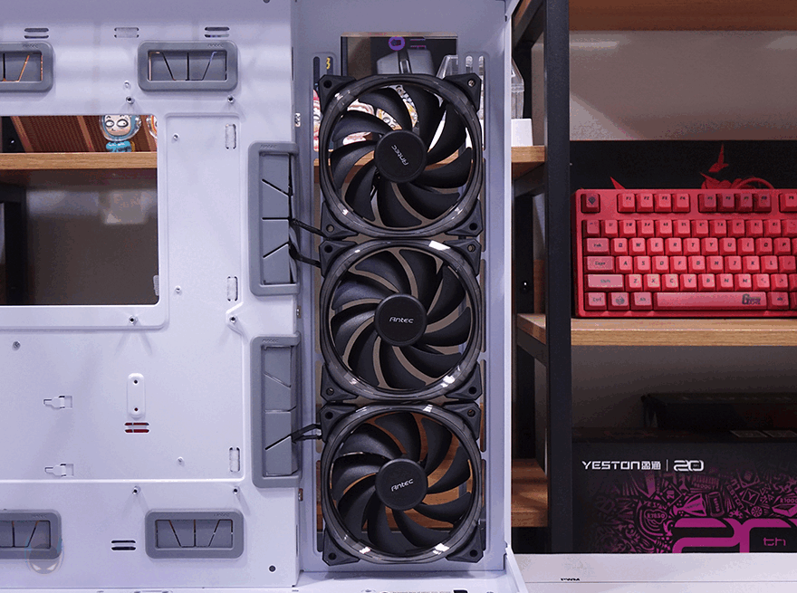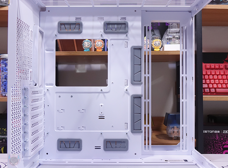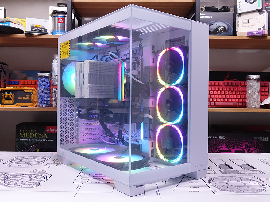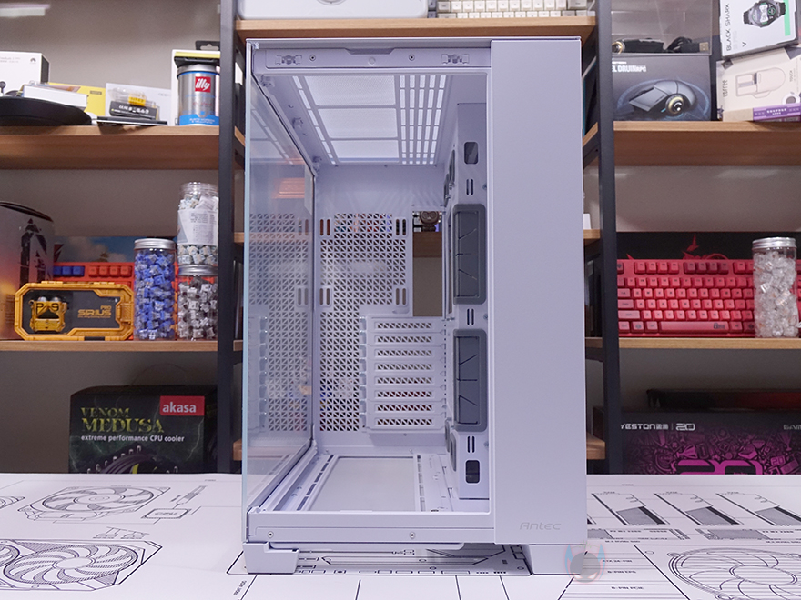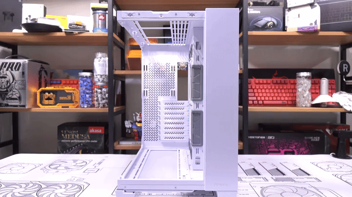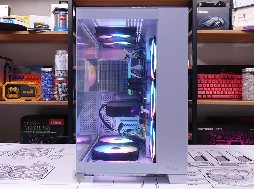 C8 케이스에는 기본 제공되는 팬이 없기 때문에, 최종적으로 팬까지 사용자가 선택해서 장착해줘야 합니다. 측면과 상단, 하단, 후면까지 팬을 모두 장착하면 막강한 쿨링효과를 누릴 수 있으며, RGB 팬을 사용한다면 조립 후 화려한 시각효과를 전면과 측면 강화유리 패널을 통해 외부에서도 감상할 수 있죠. 일반적으로 이런 파노라마-뷰 시각의 어항케이스는 대각선 방향이나 측면에서 감상할 때 가장 효과가 크죠.