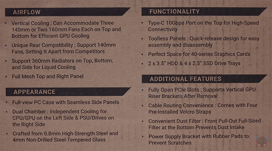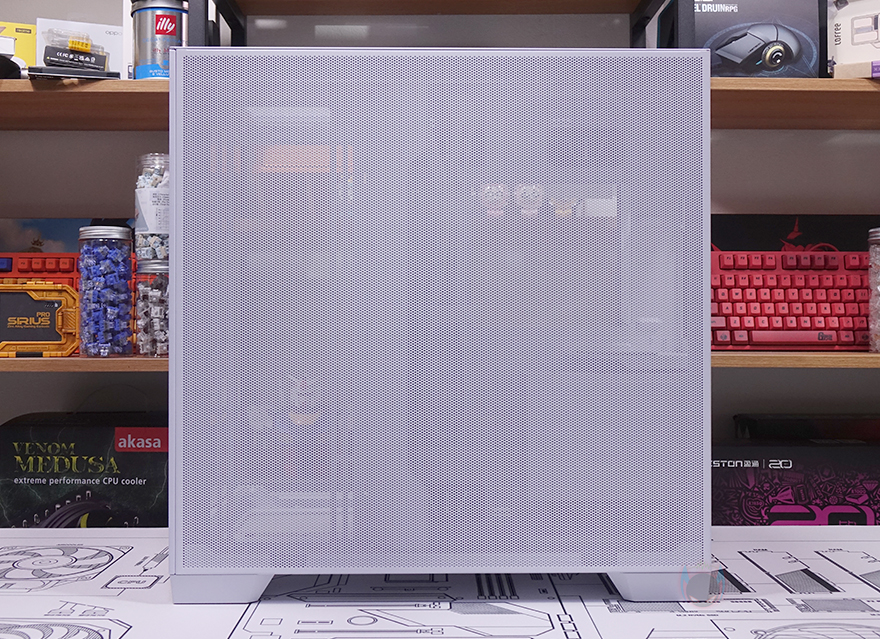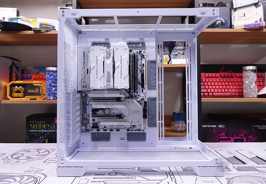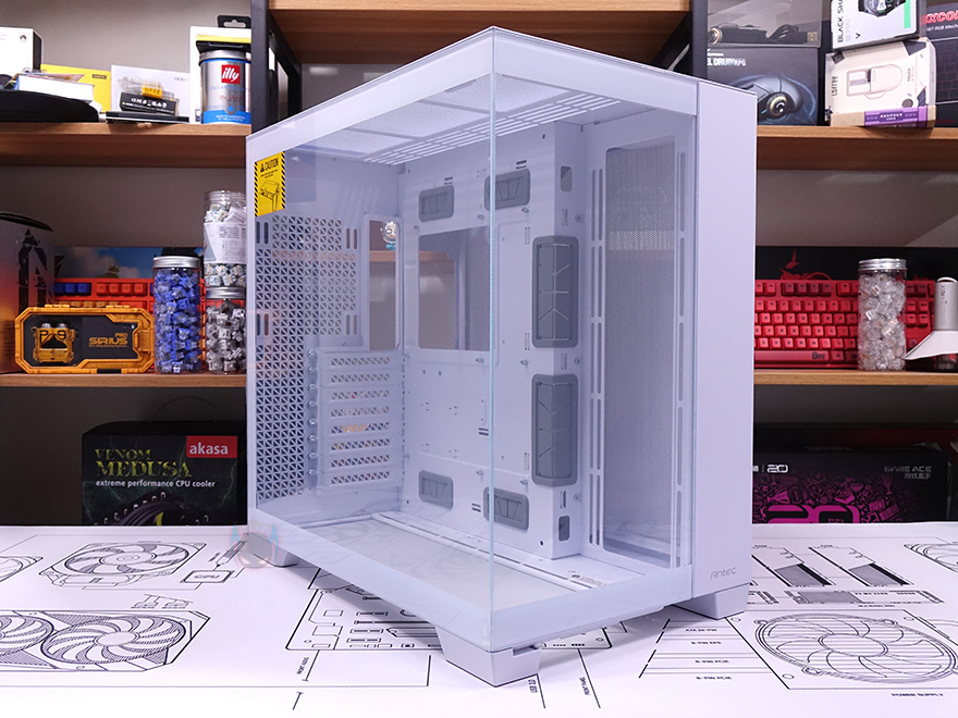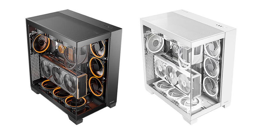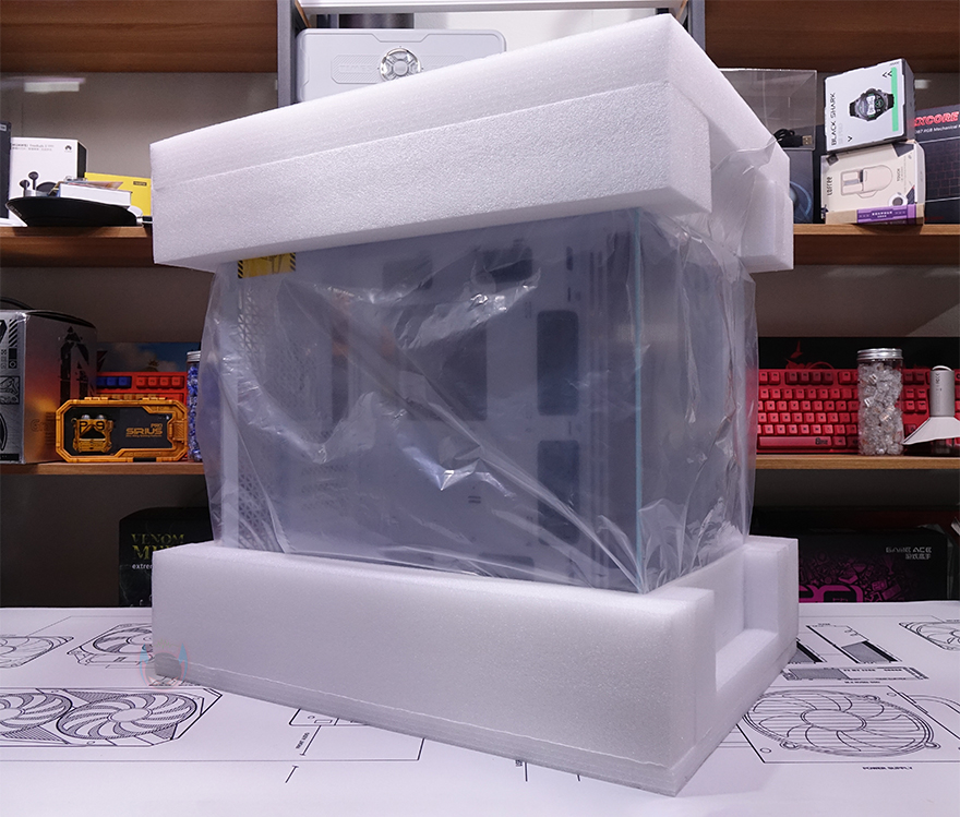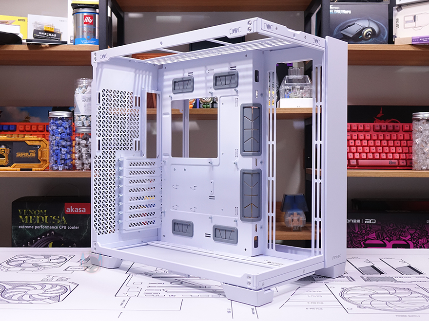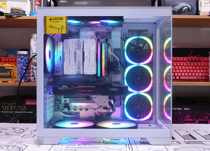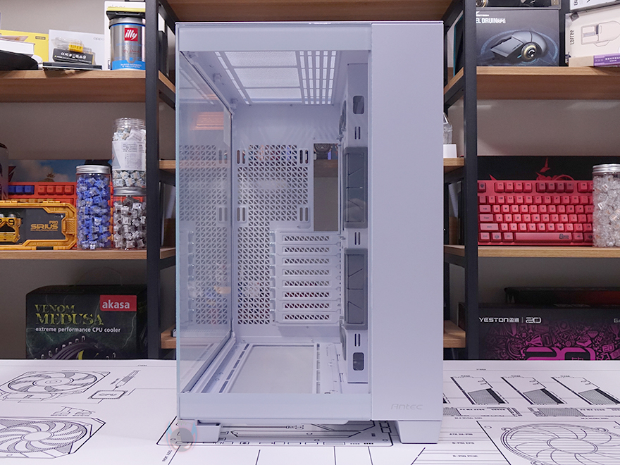 C8 케이스에는 기본 제공되는 팬이 없기 때문에, 최종적으로 팬까지 사용자가 선택해서 장착해줘야 합니다. 측면과 상단, 하단, 후면까지 팬을 모두 장착하면 막강한 쿨링효과를 누릴 수 있으며, RGB 팬을 사용한다면 조립 후 화려한 시각효과를 전면과 측면 강화유리 패널을 통해 외부에서도 감상할 수 있죠. 일반적으로 이런 파노라마-뷰 시각의 어항케이스는 대각선 방향이나 측면에서 감상할 때 가장 효과가 크죠.