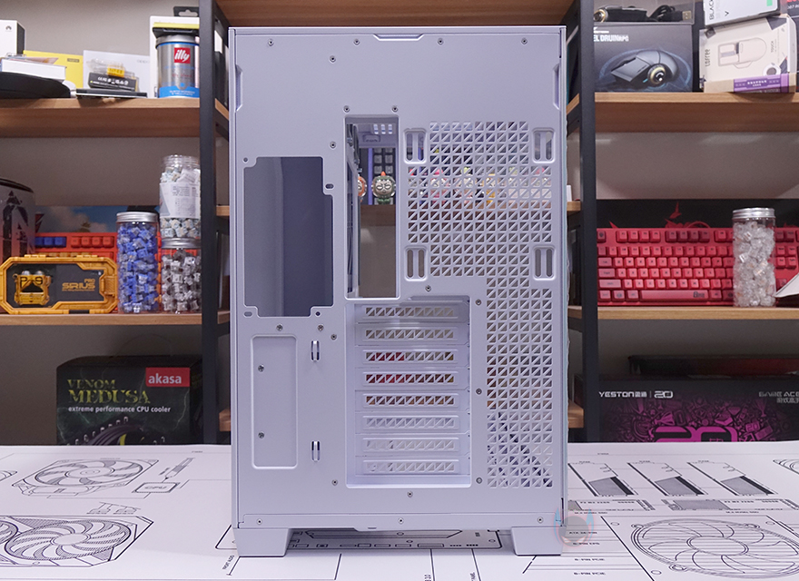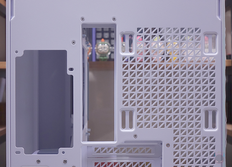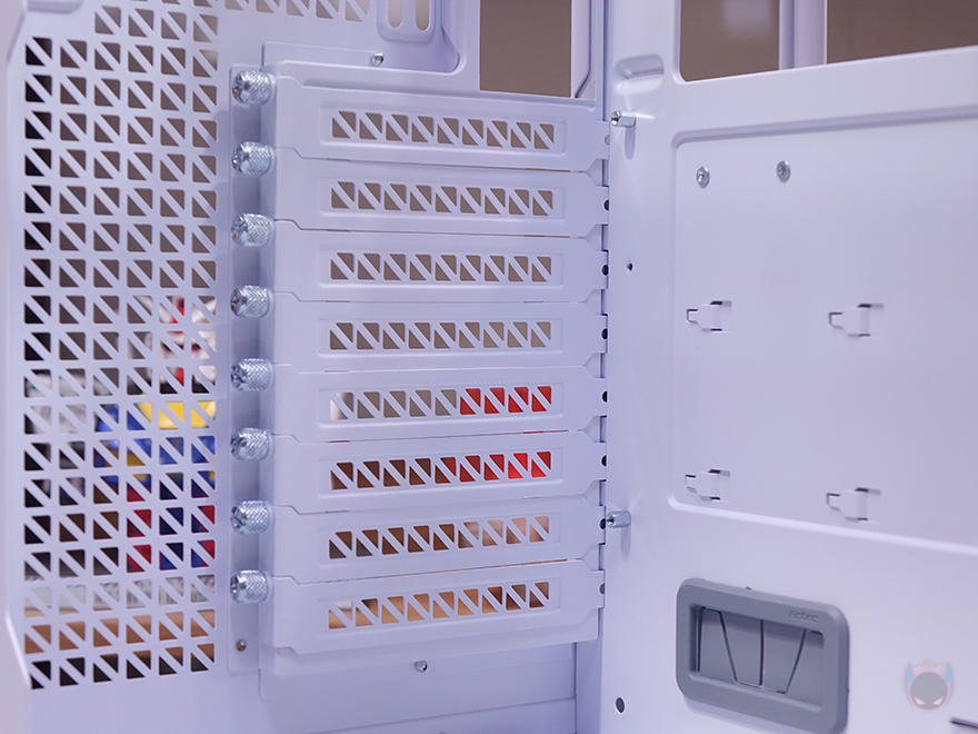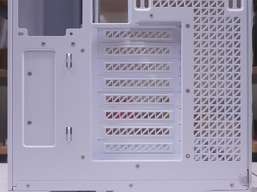 C8 케이스 후면에는 앞서 전면 너비에서 언급했듯이 파워서플라이가 메인보드 트레이 후면에 장착되는 구조임을 확인할 수 있으며, 후면 오른쪽에는 배기 역할로 일정패턴을 가진 디자인으로 에어홀 처리를 해놨습니다. 또한, 팬을 장착할 수 있게 나사홀도 처리되어 있는데, 140/120mm 1개를 장착할 수 있죠. 그리고, 바로 아래에는 PCI슬롯으로 미들타워 기준보다 1개 더 많은 8개를 갖추고 있어서 다시 한번 일반 미들타워 크기보다는 좀 더 큰 부피를 가진 케이스라는 걸 알 수 있으며, 같은 위치에 내부 오른쪽에는 뒤에서 확인하겠지만, 저장장치가 장착되는 위치입니다.