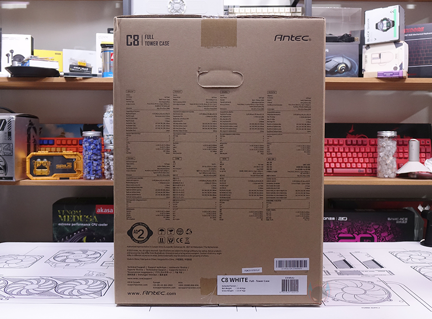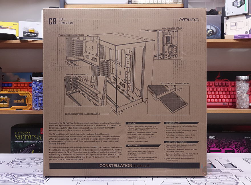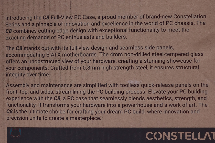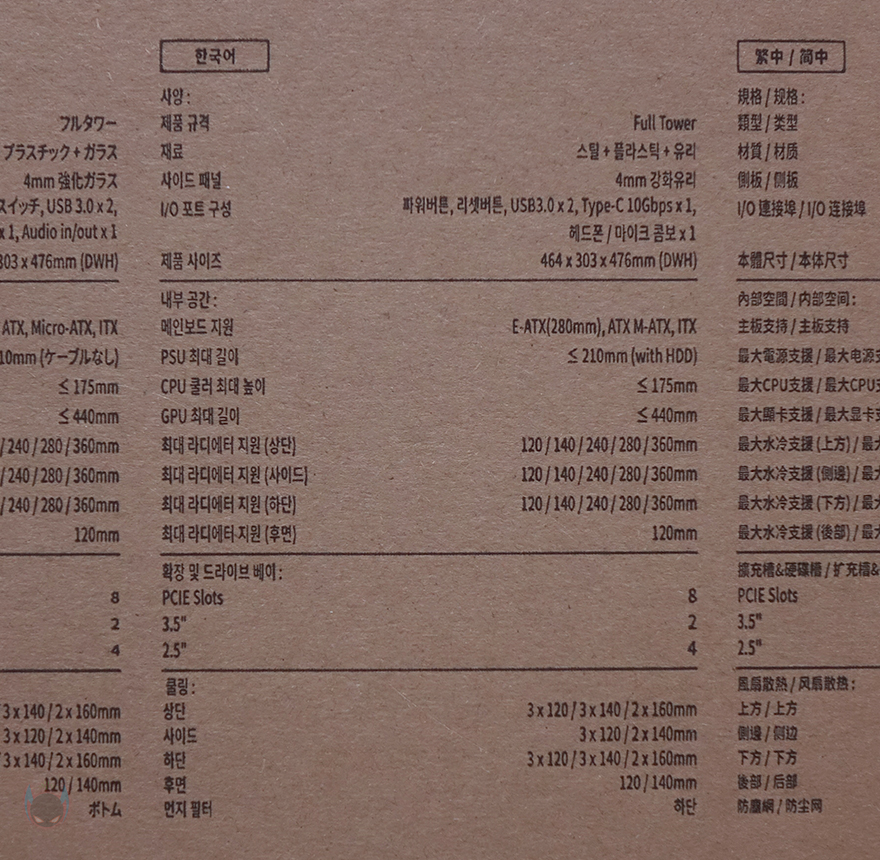 제품박스부터 살펴보면, 박스 전면에는 모델명과 함께 풀-타워 케이스라는 문구를 확인할 수 있듯이 C8은 어항케이스에서도 제법 부피가 있는 제품입니다. 그래서, 박스 패키지도 큰 편이죠. 모델명 외에도 제품 이미지를 담고 있어서 C8 디자인 부분을 미리 간접적으로 확인을 할 수 있으며, 박스 후면에는 부위별 주요 특징을 이미지로 부각하면서 아래에 C8 소개문구와 쿨링, 부품 장착 규격 지원 등에 대한 제품 특징을 표기해 놨습니다. 그리고, 박스 한쪽 측면에는 이번 첫 시리즈인 Constellation 로고 문구를 새겨놨으며, 반대쪽에는 제품 기본사양을 다국적 언어로 표기해놨는데, 한국어도 포함되어 있죠. 크기부터 쿨러 높이, 그래픽카드 길이, 쿨링 지원 등 상세하게 표기해 놨습니다.