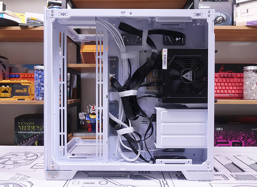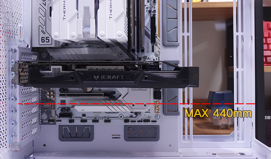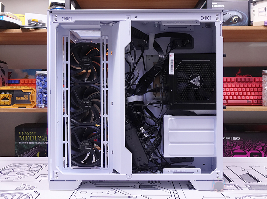 직접, Antec(안텍) C8 PC케이스를 사용해 시스템 조립을 해보면, 내부 공간이 상당히 넓기 때문에 전체적으로 조립에 어려움이나 간섭 발생은 적습니다. 부품별로 언급하자면, 메인보드 같은 경우에도 E-ATX 폼 규격까지 장착이 가능하고, CPU 쿨러 같은경우에도 타워형 쿨러 기준으로 최대 175mm 높이까지 지원해주고 있어서, 사실상 시중에 판매되는 최신 CPU 쿨러들은 대부분 장착이 가능합니다. 그리고, 그래픽카드(VGA) 같은경우에도 최대 440mm 길이까지 장착할 수 있어서 판매중인 제품들은 대부분 장착이 가능하죠. 또한, Antec에도 그래픽카드를 수직방향으로 장착할 수 있는 브라켓 제품을 별도로 판매하고 있어서 수직방향으로도 장착할 수 있습니다. 케이블정리 같은경우에도 앞서 확인했듯이 후면 공간이 90mm이기 때문에 정리가 수월하며, 대충 정리해도 앞서 확인한 에어 덕트 파티션이 있어서 케이블을 가려주는 효과도 있습니다.