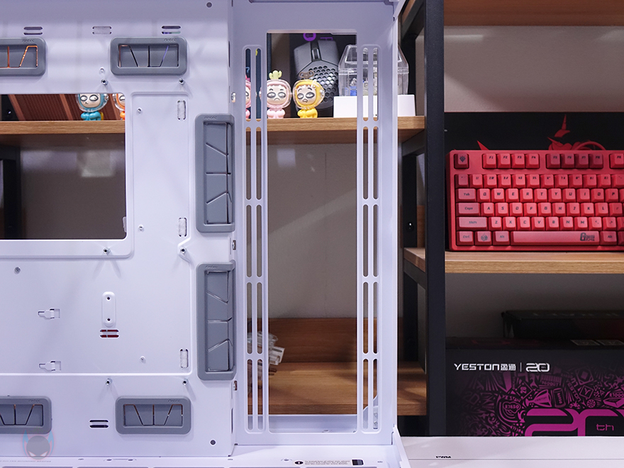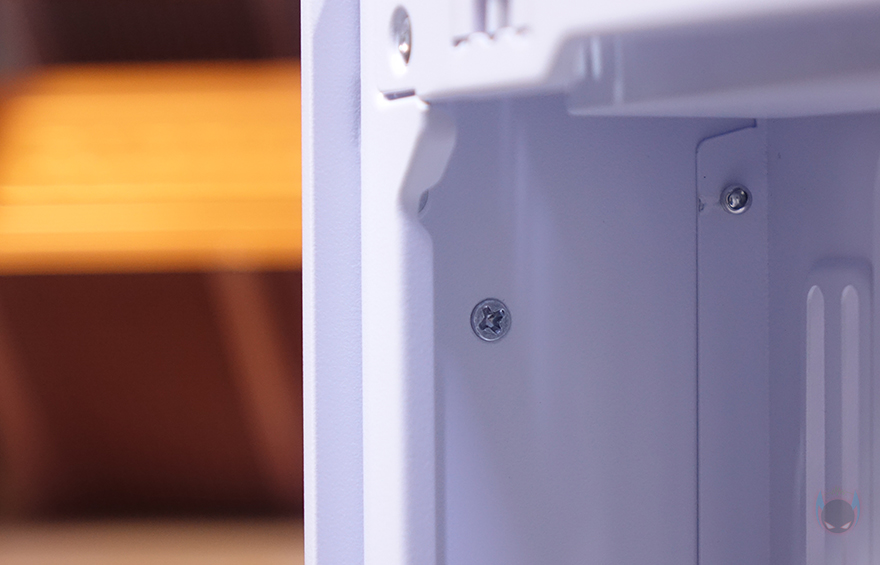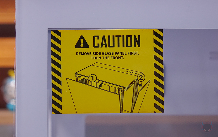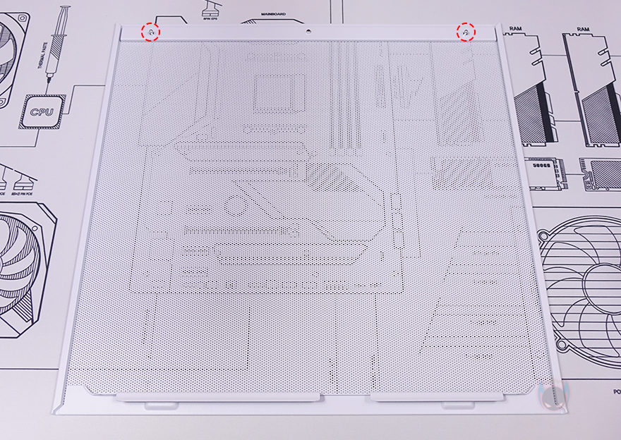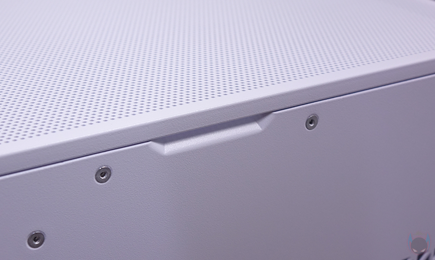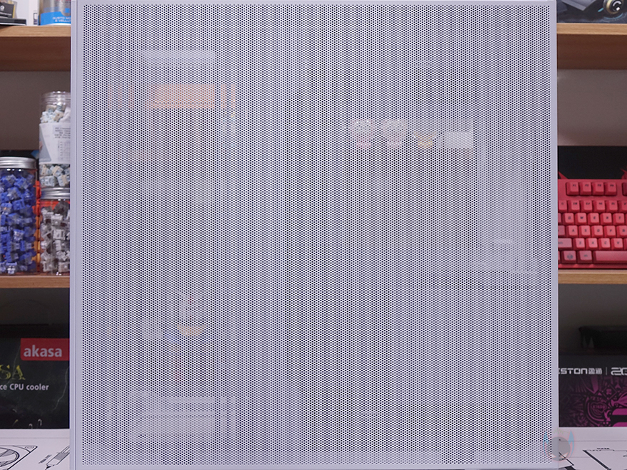사이드 패널 같은 경우에도 전면기준 왼쪽 패널이 강화유리로 왼쪽 윗부분 모서리 부근에는 주의안내 스티커를 부착해 놨는데, 강화유리 패널 분리 순서를 사이드 패널을 1번, 전면 패널은 2번으로 언급하고 있습니다. 무나사 방식이라 꼭 이 부분을 지킬 필요는 없지만, 가장 안정적으로 분리하는 순서는 사이드 패널 1번, 상단 패널 2번, 그리고 전면패널 3 번순으로 분리하면 됩니다. 사이드 패널 강화유리 역시 후면 윗부분에 분리-홈을 확인할 수 있으며, 역시 윗부분만 앞으로 조금 당기면서 위로 올리면 쉽게 분리가 됩니다. 물론, 사이드 패널 강화유리도 안쪽에 볼헤드-핀과 걸쇠방식을 적용했죠. 그리고, 반대쪽인 오른쪽 사이드 패널은 쿨링시스템 효과를 위해 전체 메쉬 디자인을 적용했는데, 흔히 PC케이스에서 볼 수 있는 에어홀 크기의 메쉬 디자인이 아니라 PC케이스 먼지 필터 구멍크기 정도의 에어홀 디자인으로 적용했습니다. 그래서, 흔히 말하는 환-공포증은 없겠습니다. 오른쪽 사이드 패널 역시 분리는 무나사 방식으로 같고, 강화유리 패널과 조금 차이점이라면 볼헤드-핀 크기가 약간 작습니다. 이는 아무래도 샤시 패널이기 때문에 위험성도 적고 장착 시 충격발생 크기도 작게 하기 위함이라 볼 수 있죠.