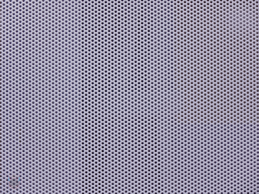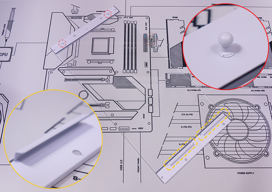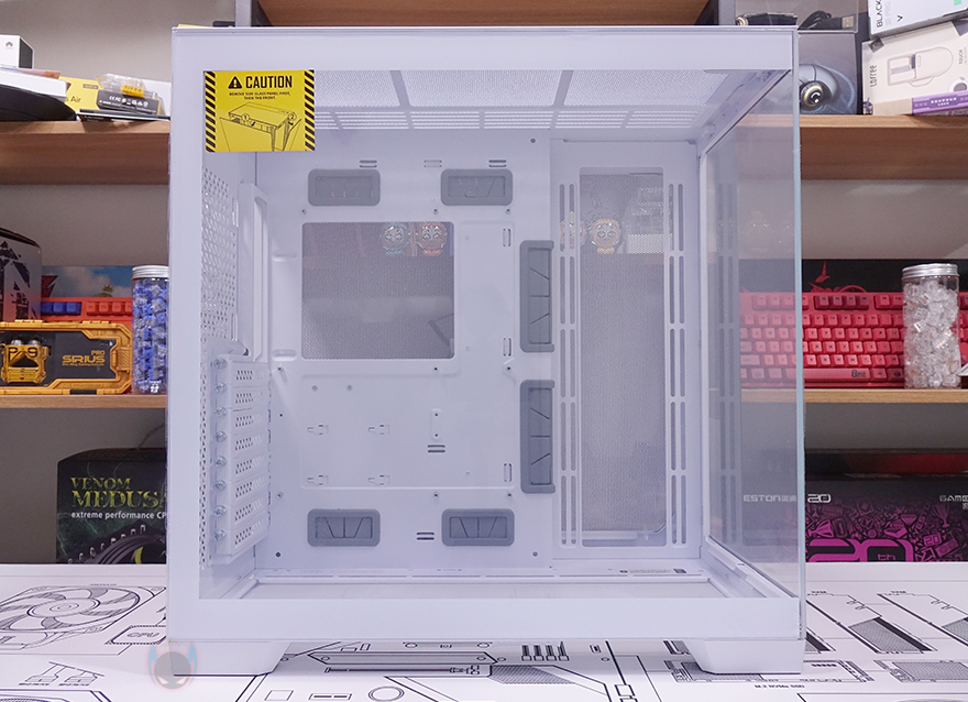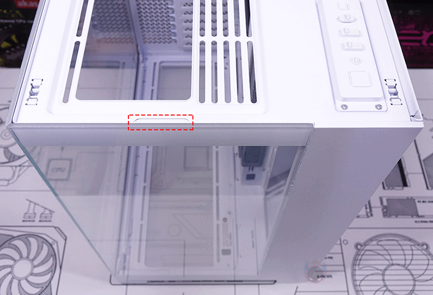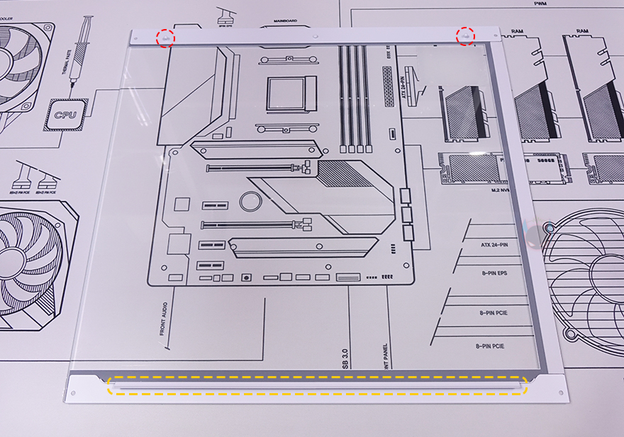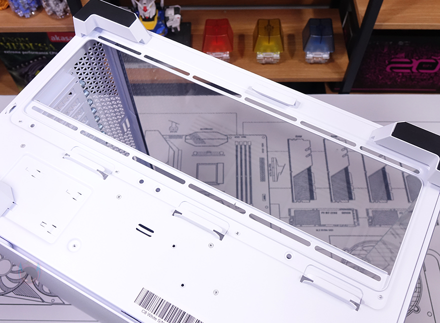 사이드 패널 같은 경우에도 전면기준 왼쪽 패널이 강화유리로 왼쪽 윗부분 모서리 부근에는 주의안내 스티커를 부착해 놨는데, 강화유리 패널 분리 순서를 사이드 패널을 1번, 전면 패널은 2번으로 언급하고 있습니다. 무나사 방식이라 꼭 이 부분을 지킬 필요는 없지만, 가장 안정적으로 분리하는 순서는 사이드 패널 1번, 상단 패널 2번, 그리고 전면패널 3 번순으로 분리하면 됩니다. 사이드 패널 강화유리 역시 후면 윗부분에 분리-홈을 확인할 수 있으며, 역시 윗부분만 앞으로 조금 당기면서 위로 올리면 쉽게 분리가 됩니다. 물론, 사이드 패널 강화유리도 안쪽에 볼헤드-핀과 걸쇠방식을 적용했죠. 그리고, 반대쪽인 오른쪽 사이드 패널은 쿨링시스템 효과를 위해 전체 메쉬 디자인을 적용했는데, 흔히 PC케이스에서 볼 수 있는 에어홀 크기의 메쉬 디자인이 아니라 PC케이스 먼지 필터 구멍크기 정도의 에어홀 디자인으로 적용했습니다. 그래서, 흔히 말하는 환-공포증은 없겠습니다. 오른쪽 사이드 패널 역시 분리는 무나사 방식으로 같고, 강화유리 패널과 조금 차이점이라면 볼헤드-핀 크기가 약간 작습니다. 이는 아무래도 샤시 패널이기 때문에 위험성도 적고 장착 시 충격발생 크기도 작게 하기 위함이라 볼 수 있죠.