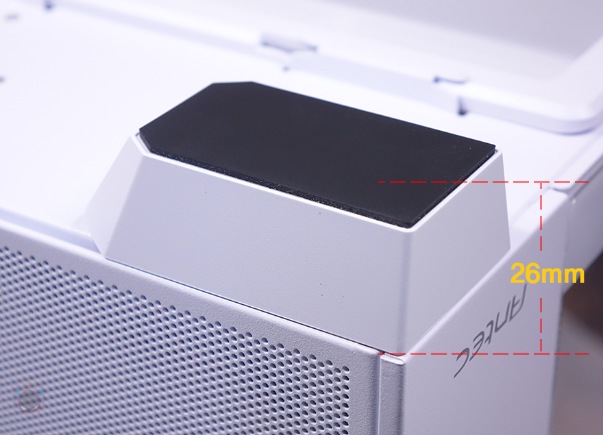 C8 케이스 외형 끝으로 케이스 밑바닥 부분을 살펴보면, 받침대는 약 26mm로 하단 쿨링효과를 위해 받침대 높이를 신경 썼으며, 미끄럼방지 및 진동소음 최소화를 위해 패드도 기본 부착되어 있습니다. 그리고, 하단에 장착된 분리형 먼지 필터 같은 경우에는 케이스를 눕히지 않고도 전면에서 바로 슬라이딩 방식으로 분리할 수 있도록 적용했죠. 먼지 필터를 분리하면 하단 역시 내부에서 쿨링시스템을 갖출 수 있게 큼지막한 에어홀 크기와 긴 나사홀을 확인할 수 있습니다. 이부분은 내부에서 다시 언급하죠.