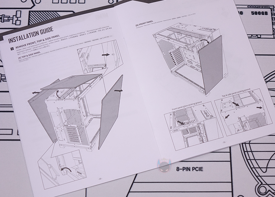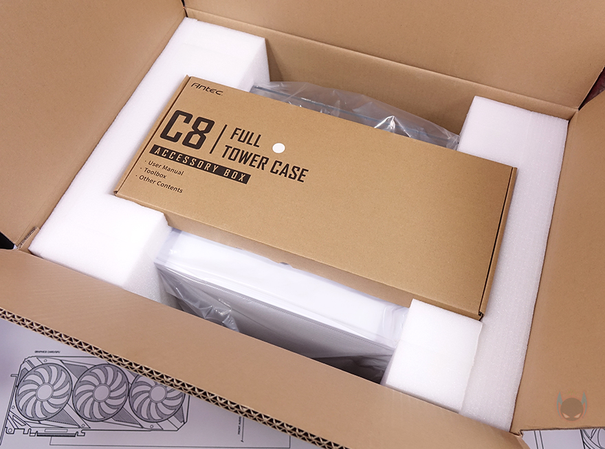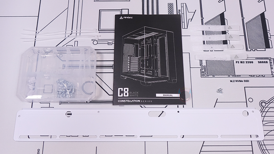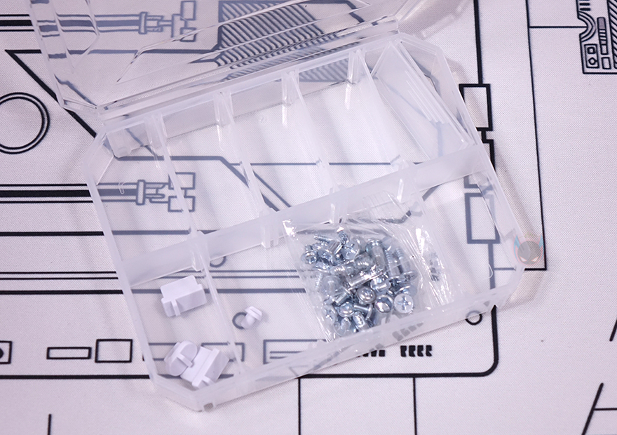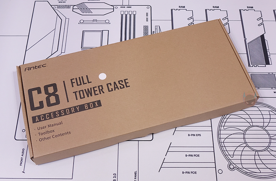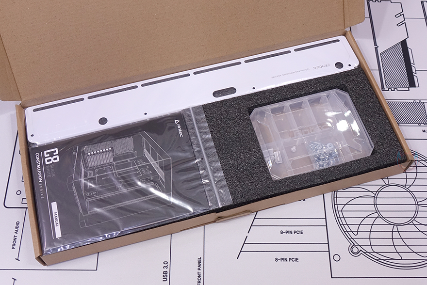박스를 열어보면, 제품 포장은 비닐포장과 함께 케이스 부피가 있는 만큼 일반 스티로폼보다 완충효과가 더 좋은 우레탄-폼을 사용했으며, C8 케이스를 제외한 나머지 구성품들은 별도의 박스에 수납되어 있습니다. 박스를 열어보면, 구성품들이 흔들리지 않게 역시 우레탄-폼을 사용했으며, 구성품에는 툴-박스, 제품 설명서, 소량의 케이블 타이와 벨크로 타이, 그리고 뒤에서 확인하겠지만 120mm 팬을 장착할 수 있게 해주는 브라켓과 나사를 제공해주고 있습니다. 툴-박스(Tool-Box)를 열어보면 부품 장착에 필요한 나사들과 추가 여분의 포트 커버가 수납된 걸 확인할 수 있죠. 그리고, 제품 설명서에는 설치가이드를 모두 그림형식으로 담고 있어서 초보자도 쉽게 이해할 수 있게 했습니다.