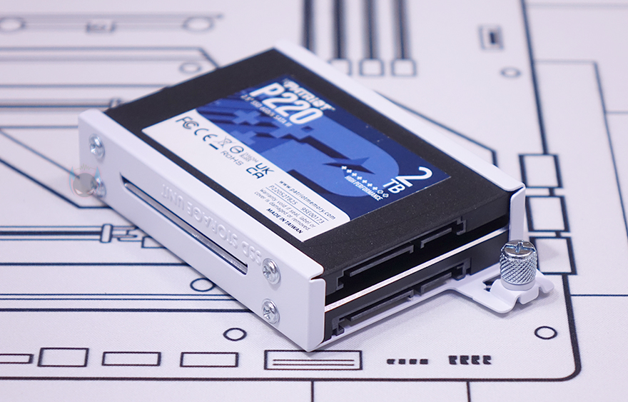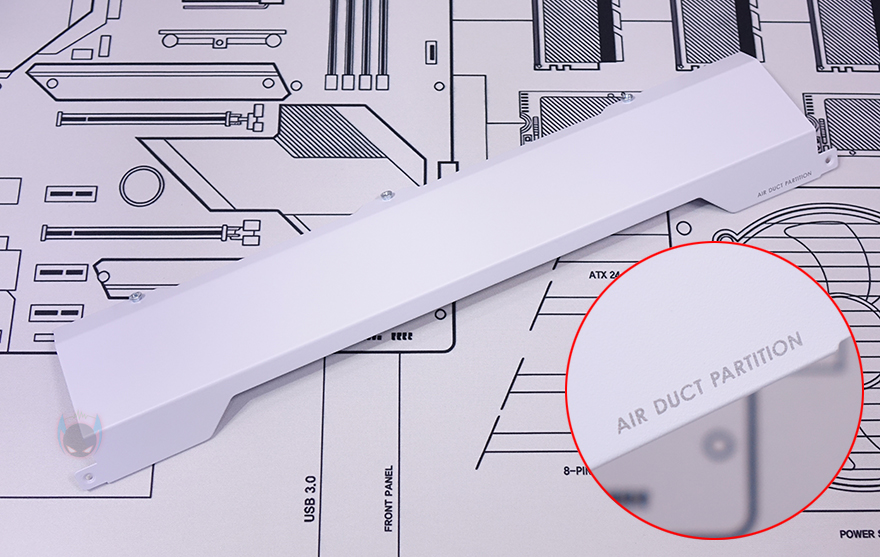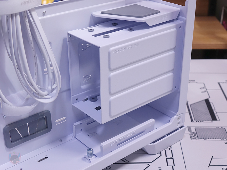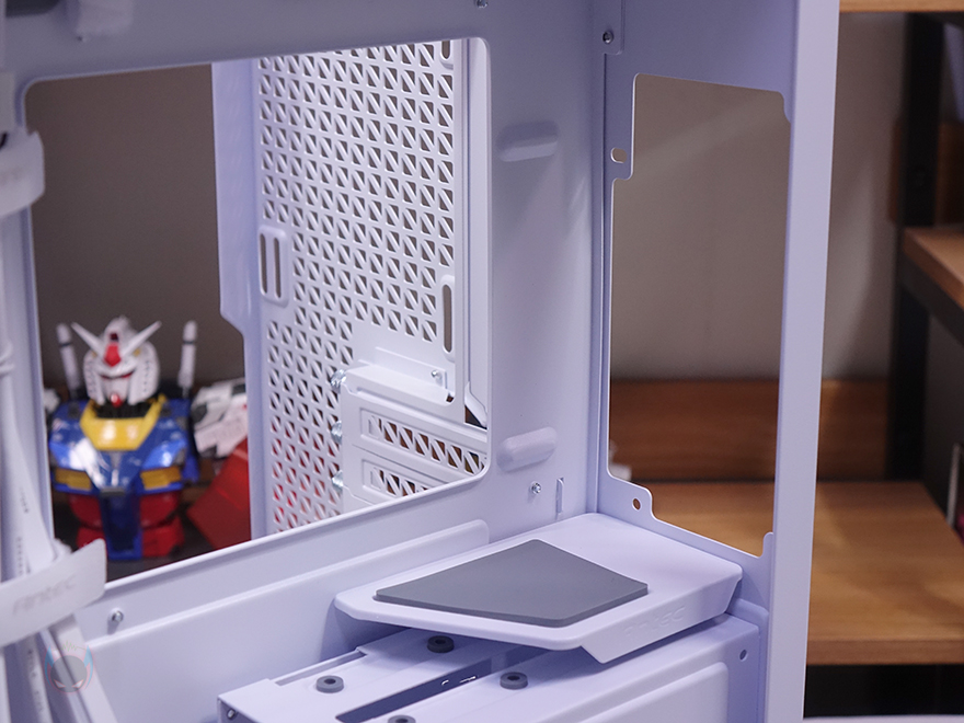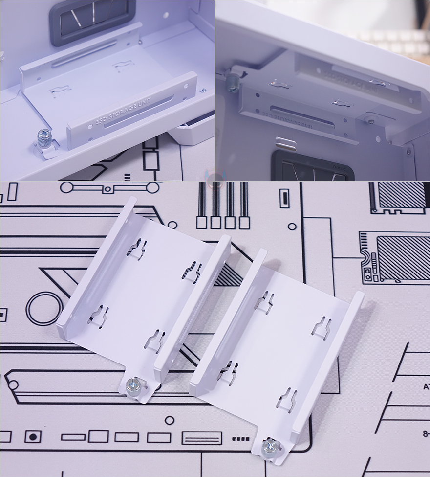 메인보드 트레이 후면 공간에는 측면 쿨링시스템의 공기흐름에 방해가 되지 않게 에어 덕트 파티션을 적용하고 있는데, 동시에 케이블 정리 공간과 구분되는 역할도 합니다. 물론, 위아래 고정나사를 풀면 쉽게 분리를 할 수 있죠. 그리고, 앞서 언급했듯이 트레이 후면공간에는 파워서플라이와 저장장치가 장착되는 공간인데, 파워서플라이 자리에는 받침대와 함께 널찍한 패드도 부착되어 있으며, 바로 아래 공간에는 3.5인치 HDD를 장착할 수 있는 HDD 베이로 외부 후면에서 고정나사를 풀면 분리가 가능하고, 수직방향으로 최대 2개까지 장착할 수 있으며, 제공되는 전용 나사를 사용하면 됩니다. 그리고, HDD 베이 자리 아래 공간에는 2.5인치 HDD/SSD를 장착할 수 있는 브라켓이 장착되어 있는데, 같은 위치에 반대편 그러니깐 내부 상단에도 동일한 브라켓이 1개 더 장착되어 있습니다. 브라켓은 손나사로 고정되어 있어서 쉽게 분리할 수 있으며, 브라켓당 2.5인치 HDD/SSD를 2개씩 최대 4개까지 장착할 수 있죠.