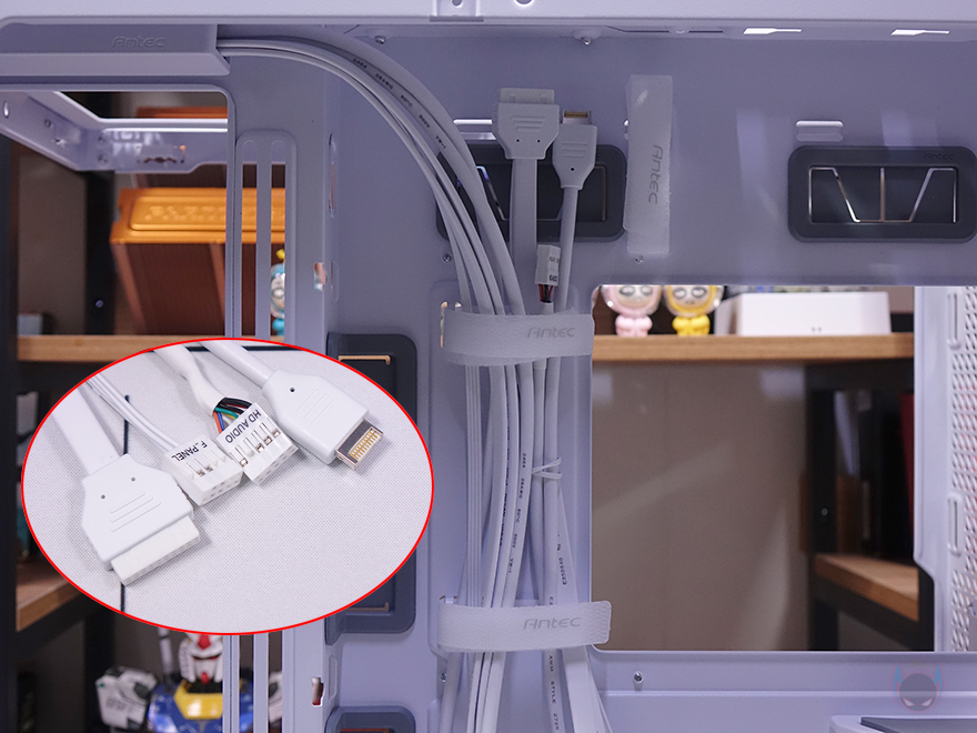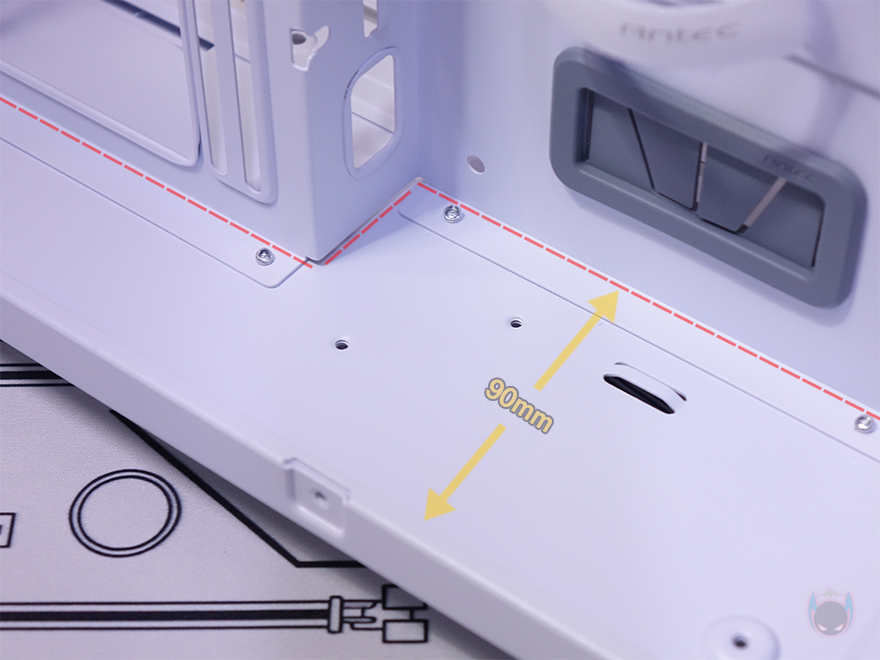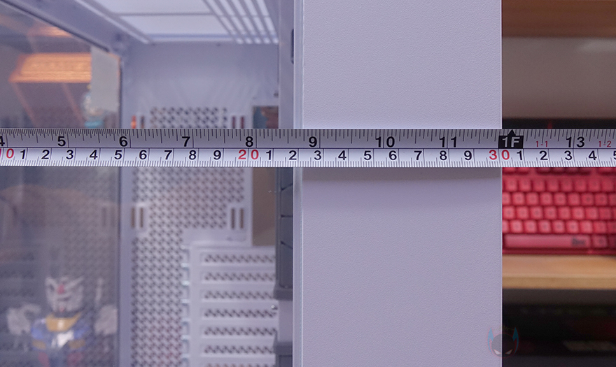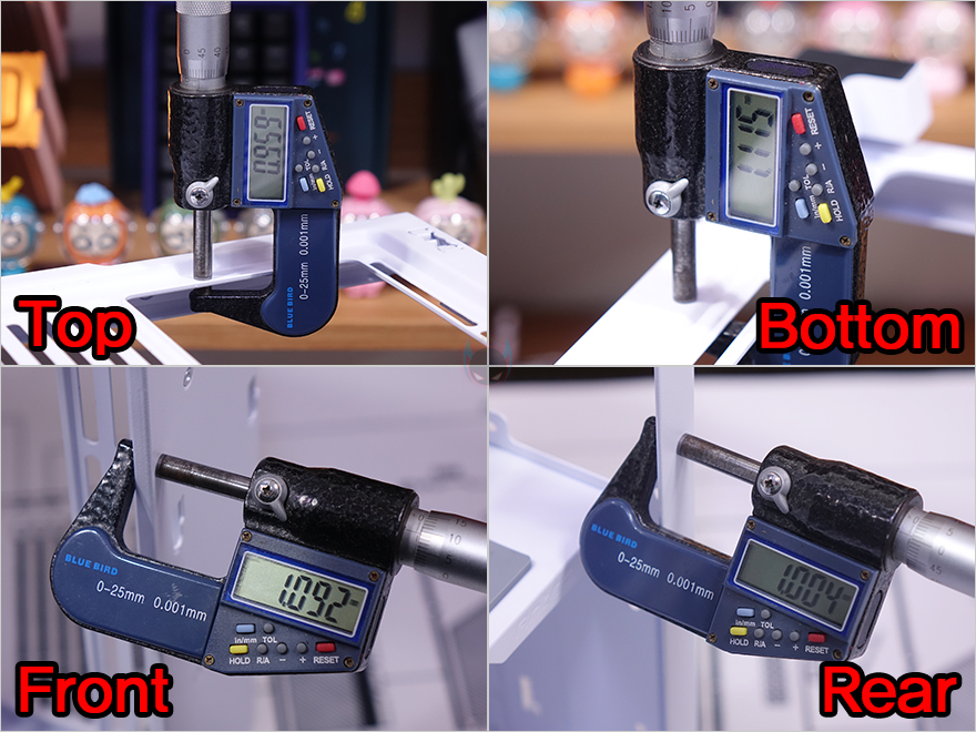그리고, 케이스 버튼 및 포트 케이블들은 개봉 시 벨크로타이로 잘 정리되어 있으며, 케이블과 커넥터까지도 모두 케이스 색상에 깔맞춤으로 적용되었습니다. 특히, 전원/리셋 버튼의 전면 패널 커넥터는 일체형으로 적용되어서 연결이 한결 수월하죠. 그리고, 상단 부분에 커버까지 적용되어서 깔끔하게 보호해주고 있습니다. 또한, 후면 공간이 90mm로 널찍해서 케이블 정리를 하기에는 부족함이 없으며, 끝으로 C8 케이스에 사용된 샤시의 두께를 부위별로 측정한 결과 약 0.9~1.1mm 대인 것을 확인할 수 있어서, 제조사 측에서 언급하는 0.8~1.0T 샤시가 사용되었음을 짐작할 수 있습니다.