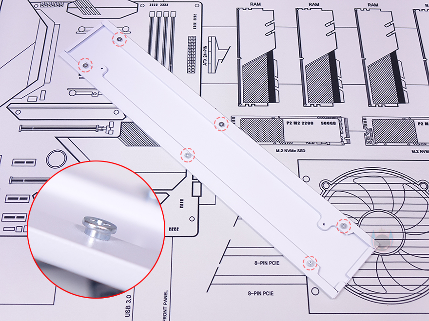 그리고, 메인보드가 장착되는 트레이(Tray) 부분에는 CPU-cut-Out을 비롯해 주변으로 케이블 정리를 할 수 있게 홀-처리와 함께 라우팅 그로밋을 적용했으며, 오른쪽 그러니깐 내부 전면 앞부분의 측면에는 측면 쿨링시스템을 갖출 수 있게 역시 에어홀과 긴 나사홀을 적용했습니다. 특히, 측면 쿨링 같은 경우에는 홀 기준으로 앞뒤 공간이 합쳐서 100mm라서 팬을 장착할 때는 앞/뒤 어느 위치에서나 장착이 가능하고, 수랭쿨러시 라디에이터 장착시에는 듀얼-팬 구성도 가능하죠. 참고로, 측면 쿨링시스템으로 팬을 장착할 때는 140mm 팬은 최대 2개, 120mm 팬은 최대 3개까지 장착이 가능하고, 수랭쿨러시 라디에이터는 360mm까지 장착할 수 있습니다. 그리고, 내부 상단 같은경우에도 공간이 최대 70mm를 확보하고 있어서 역시 수랭쿨러시 라디에이터를 듀얼팬 구성까지 할 수 있죠. 또한, PCI슬롯 가이드는 모두 재사용이 가능한 탈착식으로 적용했습니다.