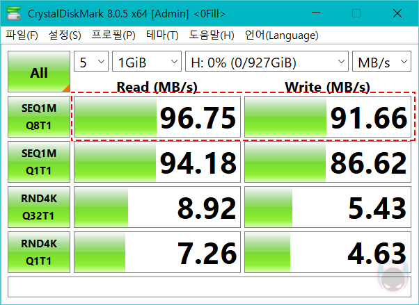 직접, 실리콘파워(SiliconPower) A1 Gaming 마이크로 SDXC 카드를 사용해보면, 일단 메모리카드 리더기에 연결해서 PC에서 CrystalDiskMark로 속도 성능을 확인해 보면, 읽기(Read)와 쓰기(Write) 속도 모두 100MB/s 근접으로 나오는 걸 확인할 수 있습니다. 참고로 앞서 제품 패키지에서 확인했듯이, 스펙상으로는 A1 Gaming의 읽기와 쓰기 속도는 각각 100MB/s와 80MB/s입니다. 그리고, 실제로 4GB 용량의 파일전송속도를 확인해 보면, 100MB/s 근접대로 유지되는 것을 확인할 수 있죠. 규격상의 속도를 잘 발휘합니다.