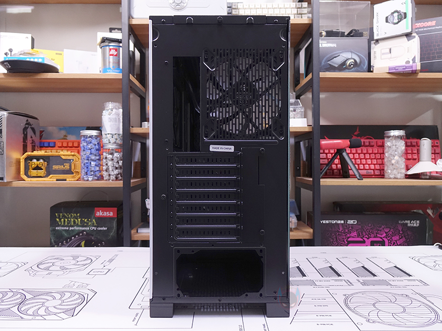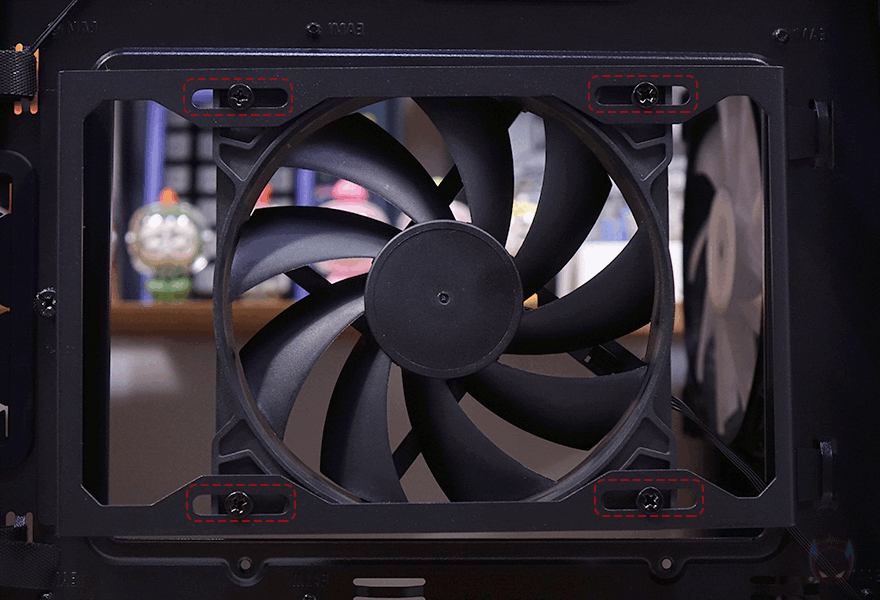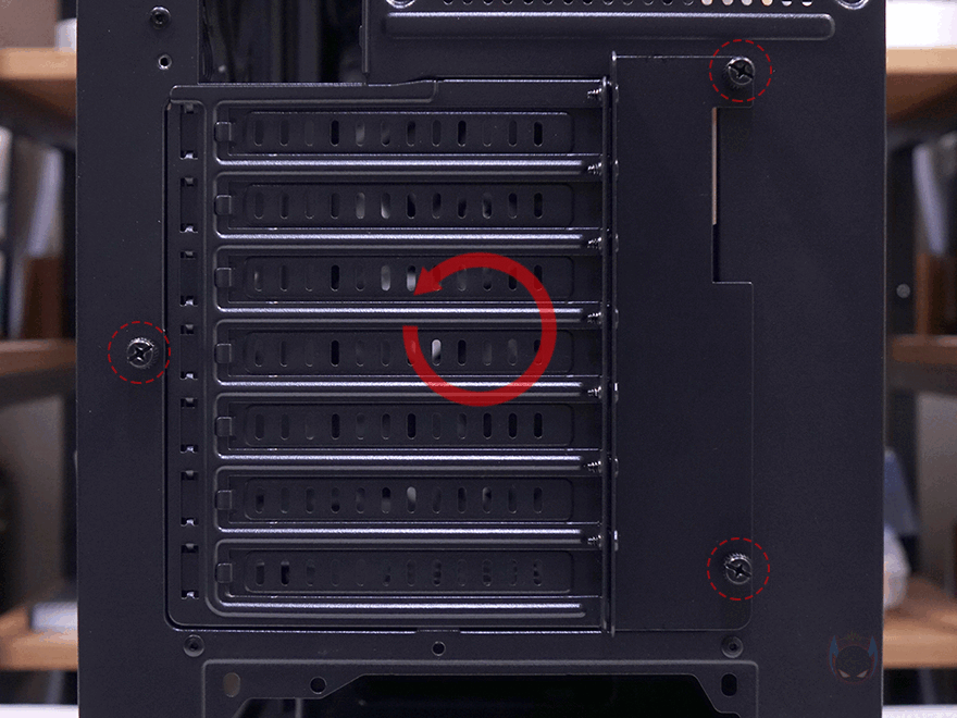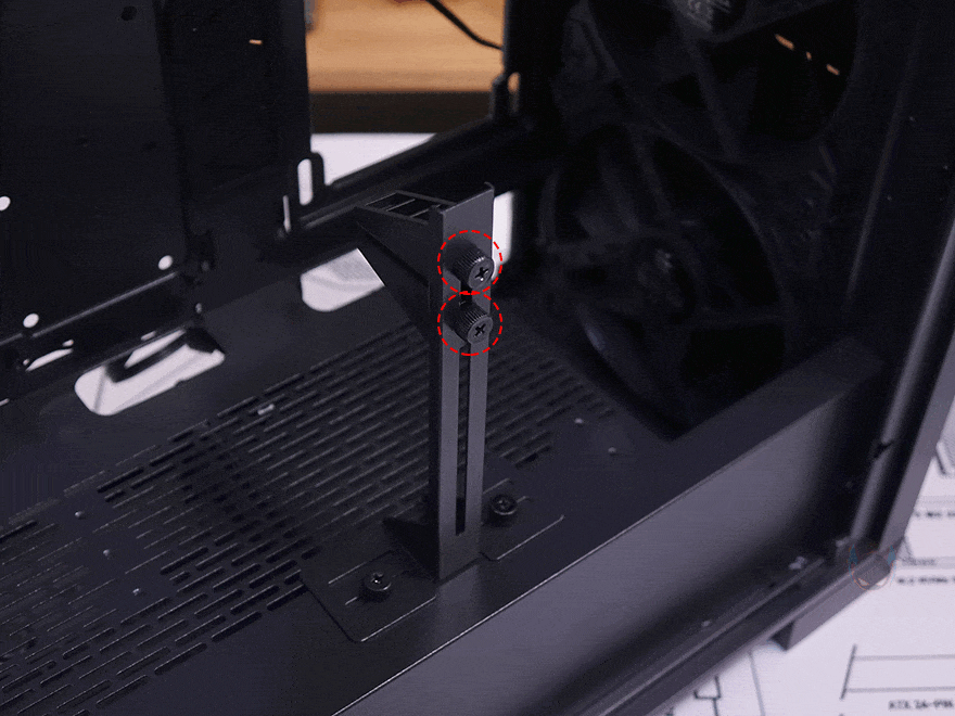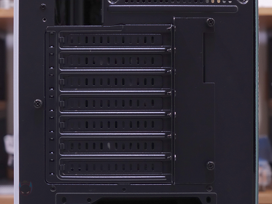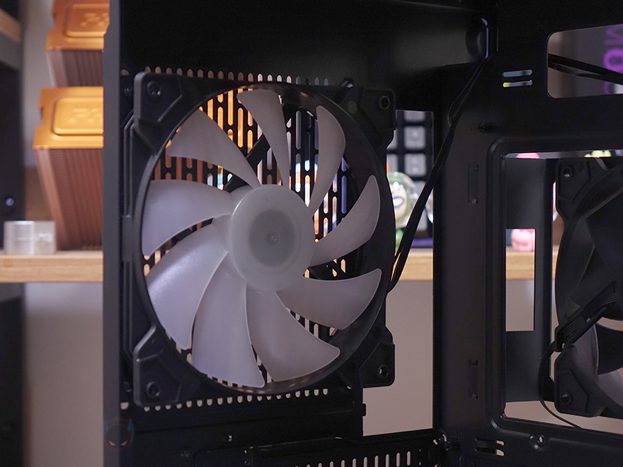 또한, 하단 커버 상단에는 일정 패턴 디자인의 에어홀 처리와 함께 그래픽카드를 수직방향으로 장착할 때 사용되는 라이저 카드를 장착할 수 있게 나사홀도 처리되어 있는데, 앞서 언급한 PCI 슬롯 방향을 90도로 변경할 수 있습니다. 후면에 위치한 손나사 3개를 풀고 90도 방향으로 장착해주면 간단히 변경되죠. 그리고, PCI 슬롯가이드는 모두 재사용이 가능한 착탈식입니다. 또한, 후면 배기 역할로 외부에서 먼저 확인했던 내부 후면 140mm 팬은 ARGB 팬이죠. 물론, 120mm 팬도 장착이 가능하기때문에 언제든지 사용자가 변경할 수 있습니다.
