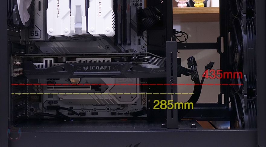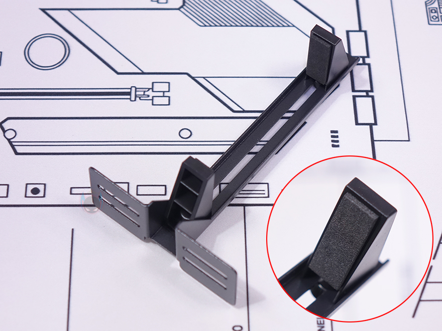 이제 마이크로닉스 EH1 몬드리안 PC케이스의 내부를 살펴보는데, 일단 메인보드가 장착되는 트레이부분 주변으로 케이블 정리를 할 수 있게 선정리 홀이 처리되어 있으며, 하단 공간에는 커버가 적용되어 있는데, 커버 상단에는 그래픽카드 지지대가 기본 장착되어 제공됩니다. 지지대는 모두 손나사로 고정되어 지지대 상하 위치조절부터 지지대 위치이동까지 모두 가능하며, 총 6곳에 나사 위치를 통해 앞뒤좌우로 위치변경할 수 있죠. 또한, 그래픽카다를 잡아주는 지지대 안쪽에는 패드도 기본 부착되어 있습니다.