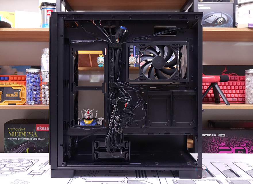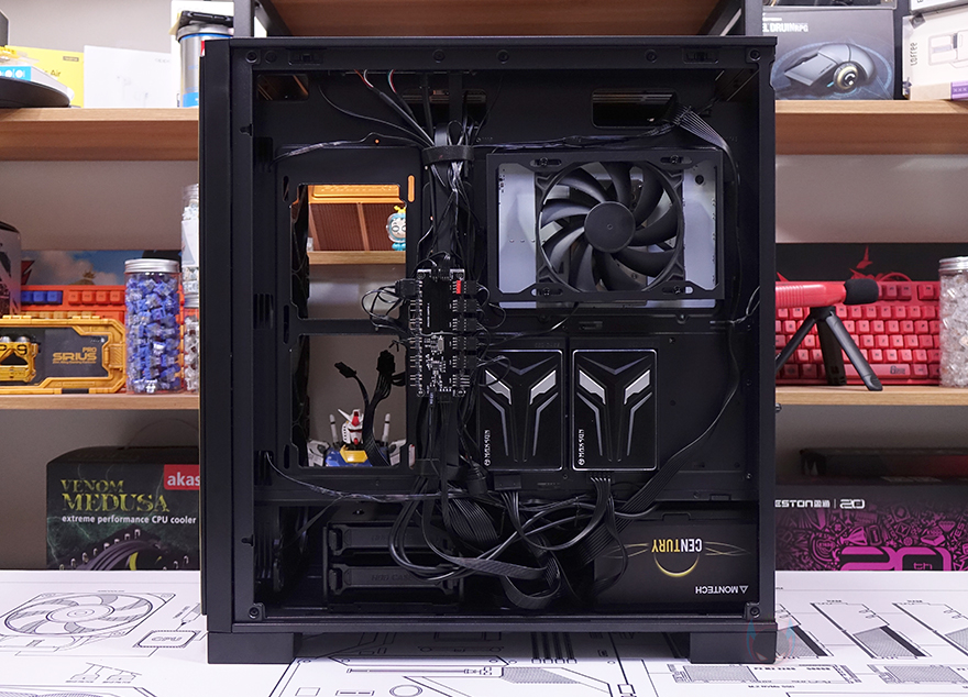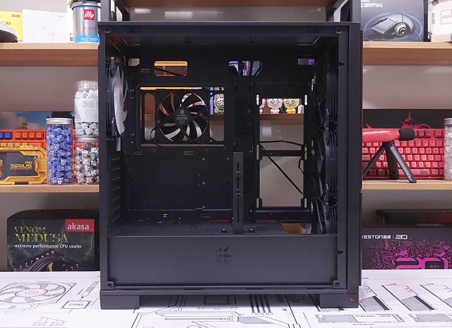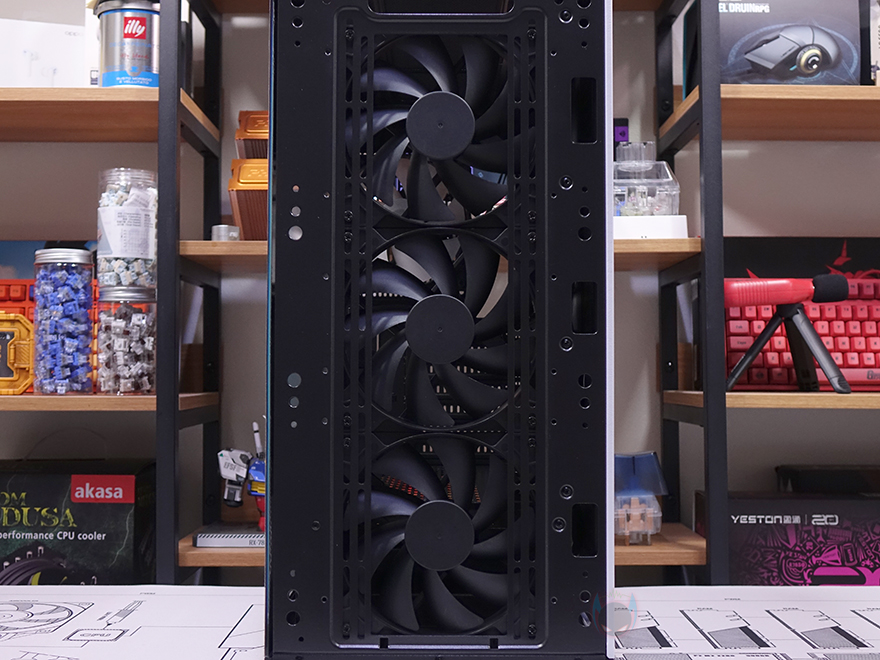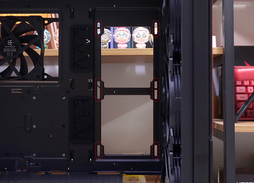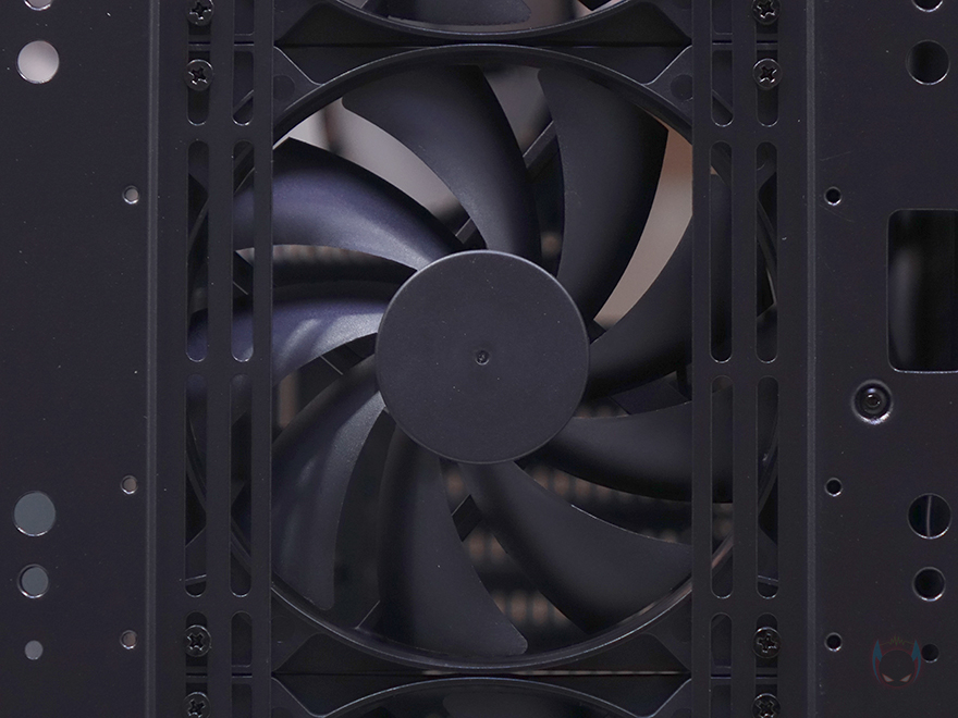 그리고, 내부 앞부분의 측면은 앞서 오른쪽 사이드 패널에서 언급했던 측면 쿨링시스템을 갖출 수 있게 큼지막한 홀 처리와 함께 양쪽으로 나사홀이 처리되어 있는데, 팬을 장착할때는 120mm 팬 2개, 수랭쿨러시에는 240mm 라디에이터를 장착할 수 있습니다. 또한, 메인보드 트레이 CPU-cut-Out 홀에는 후면에서 역시 쿨링효과를 볼 수 있게 120mm 팬이 브라켓과 함께 장착되어 있는데, 나사홀이 길게 처리되어 있어서 어느정도 좌우 위치이동이 가능하고, 브라켓도 왼쪽에 고정된 손나사만 풀면 쉽게 분리가 됩니다.