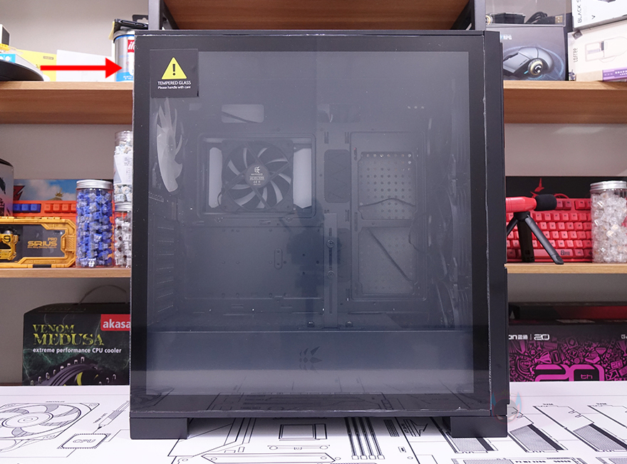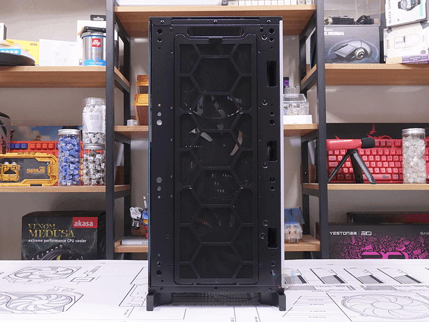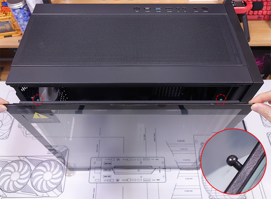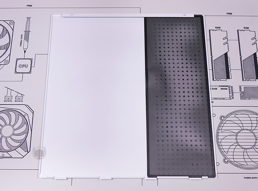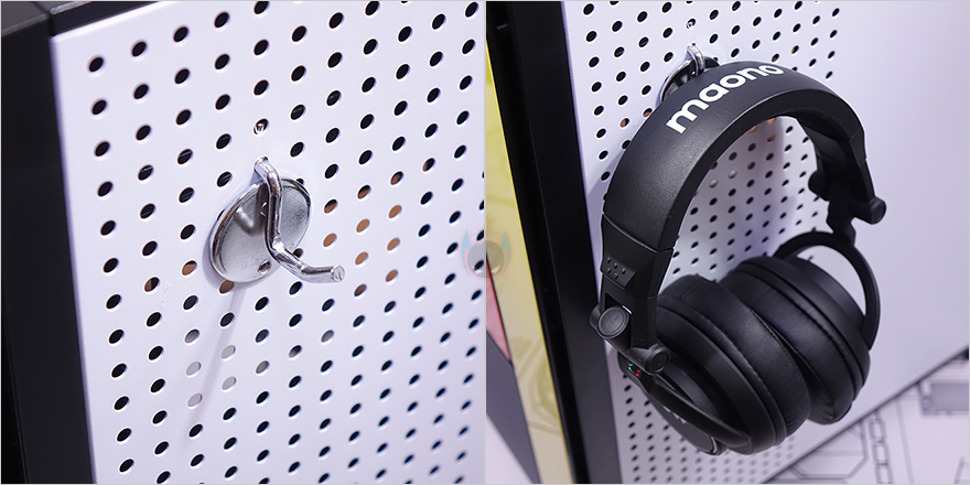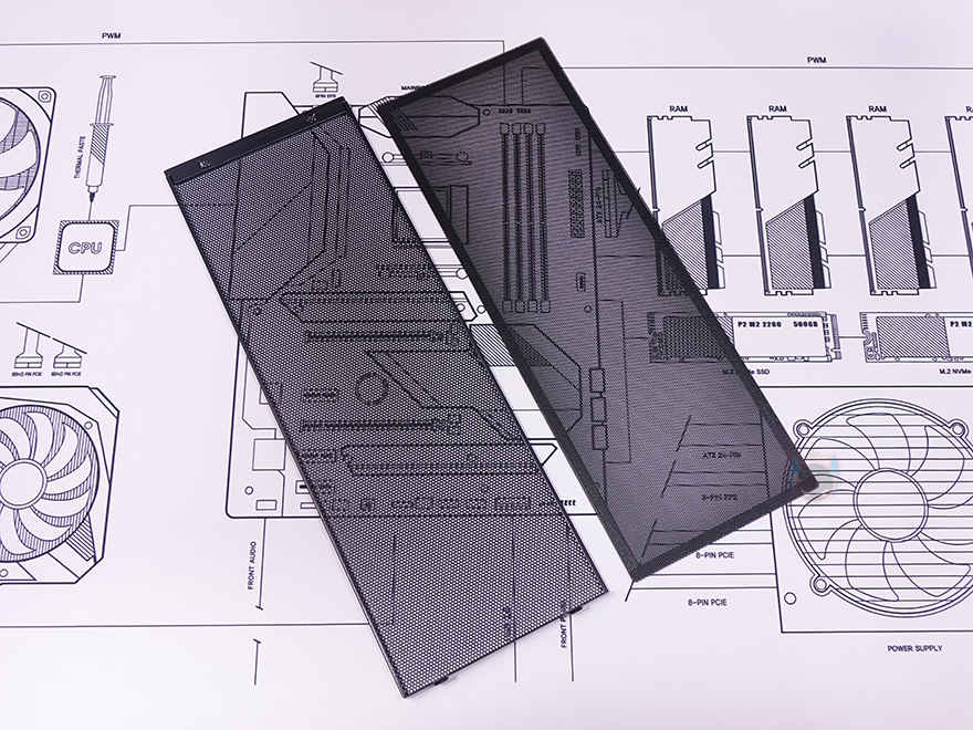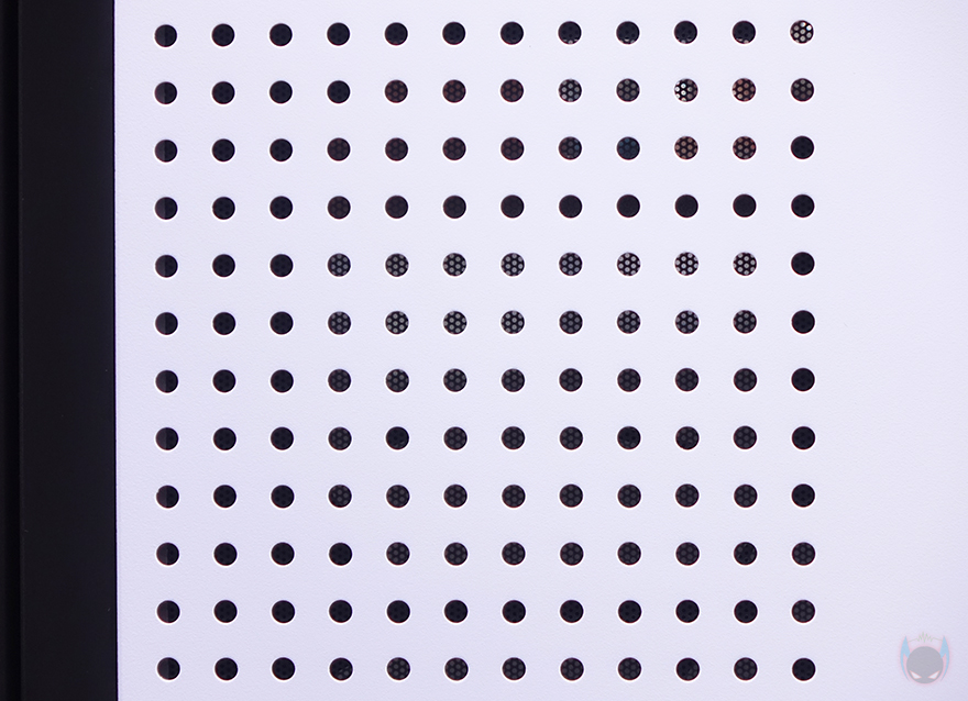 사이드 패널은 전면 기준시 왼쪽 패널은 강화유리 패널로 기본 보호비닐이 깔끔하게 붙어있어서 소비자가 뗄지말지 선택하면 되고, 후면에 홈 부분을 통해 앞으로 당기면 윗부분이 빠지는 무나사 방식의 볼-헤드핀 클램프 방식을 적용했습니다. 반대편인 오른쪽 패널은 샤시 패널로 앞부분에 에어홀 처리를 했는데, 뒤에서 확인하겠지만, 내부 같은 위치에 측면 쿨링시스템을 갖출 수 있게 지원합니다. 또한, 에어홀 크기는 일반 타공보드 크기와 같아서 타공보드에 사용하는 후크 같은 액세서리도 사용이 가능해 다양한 걸이용으로도 활용할 수 있죠. 오른쪽 패널 역시 무나사 방식이며 에어홀부분 안쪽에는 자석방식의 먼지필터가 장착되어 있습니다.