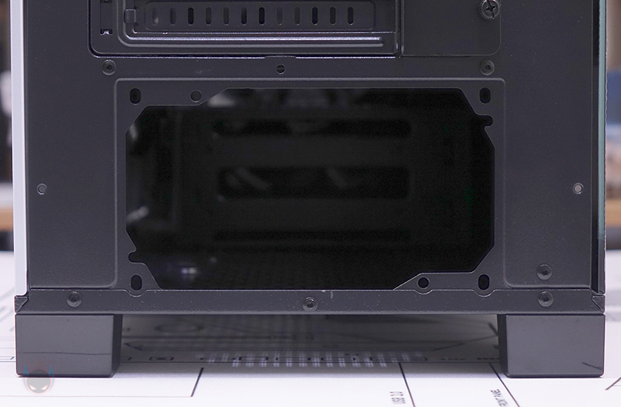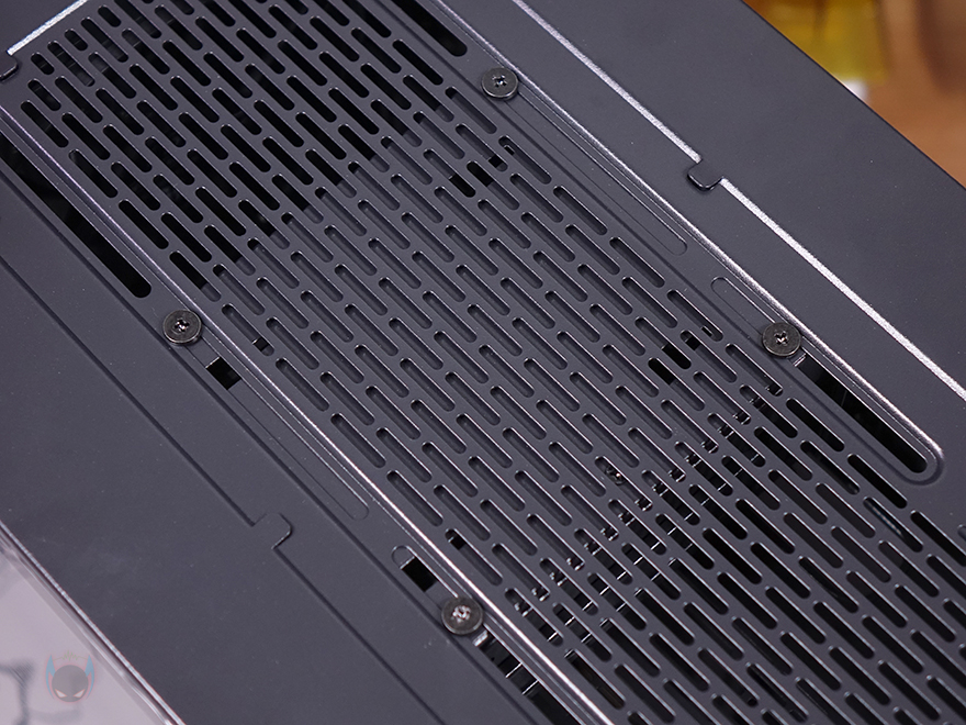 EH1 몬드리안 PC케이스 후면에는 배기역할의 에어홀 처리와 함께 내부에 140mm 팬이 기본 장착된 것을 미리 확인할 수 있으며, 아래에 PCI 슬롯은 미들타워 기준인 7개를 갖추고 있습니다. 또한, 뒤에서 확인하겠지만, 이 PCI 슬롯은 요즘 그래픽카드를 수직방향으로 장착하는 소비자들이 있는 점을 고려해 90도 방향으로 변경할 수 있게 분리도 가능하죠. 맨 아래 파워서플라이 자리는 상하방향 모두 장착이 가능하도록 나사홀이 처리되어 있습니다. 외형 끝으로, 케이스 밑바닥부분에는 약 27mm 높이의 받침대가 적용되었으며, 바닥 가운데부분으로 전체 먼지 필티가 역시 기본 장착되어 있는데, 분리하면 일정 패턴 디자인의 에어홀 처리를 확인할 수 있고, 뒤에서 확인하겠지만 내부 앞자리에 배치된 HDD를 위치조절할 수 있게 나사홀도 길게 처리되어 있습니다.