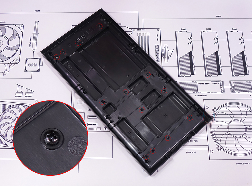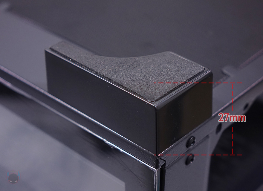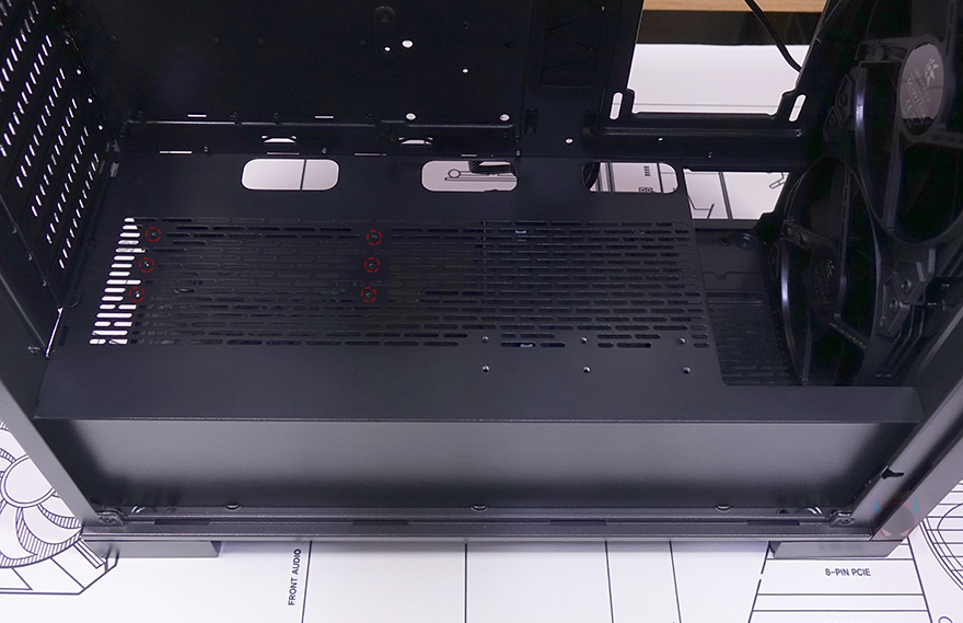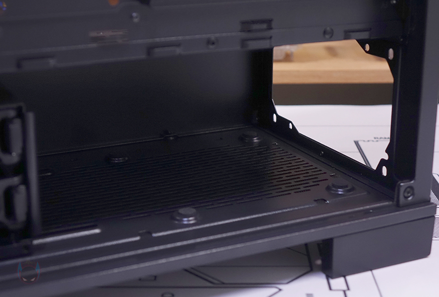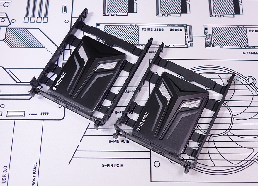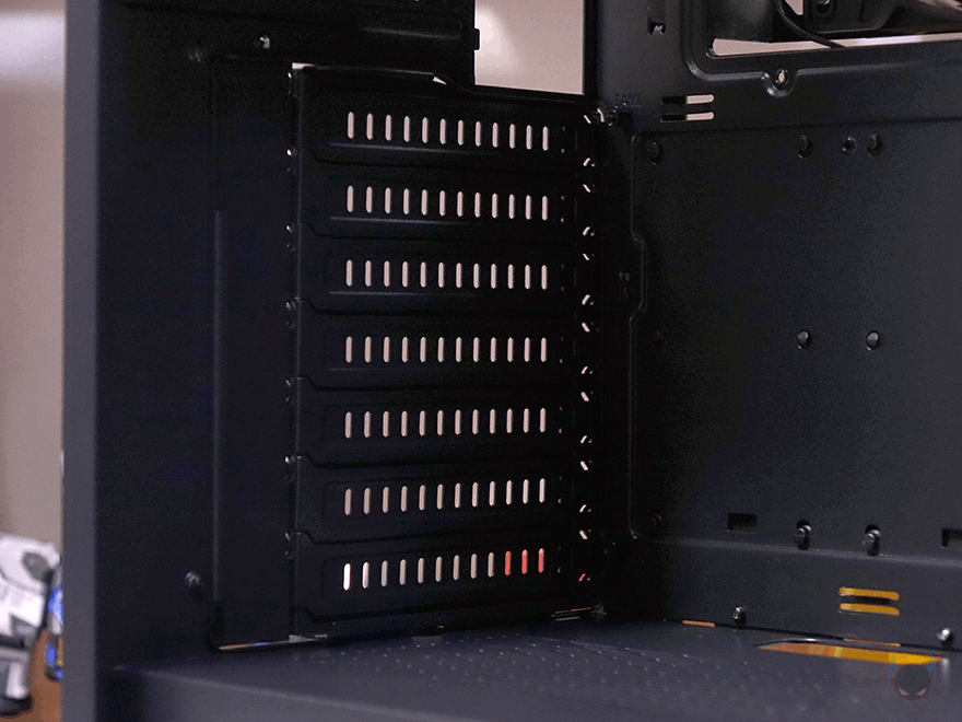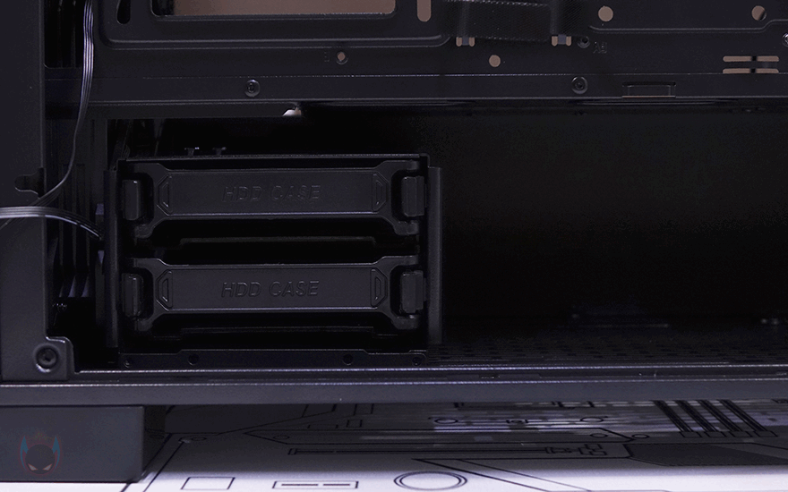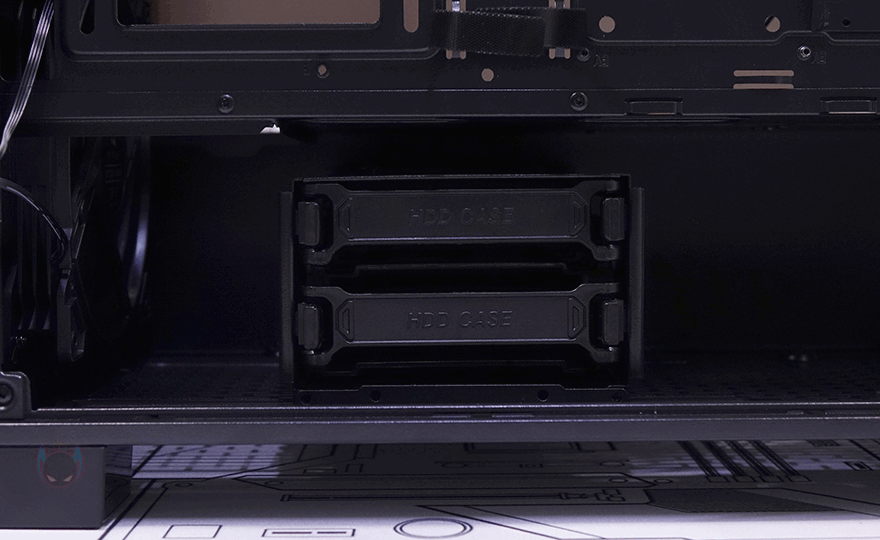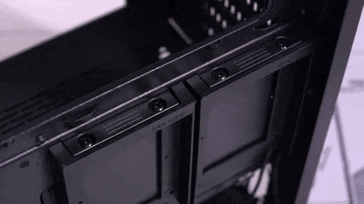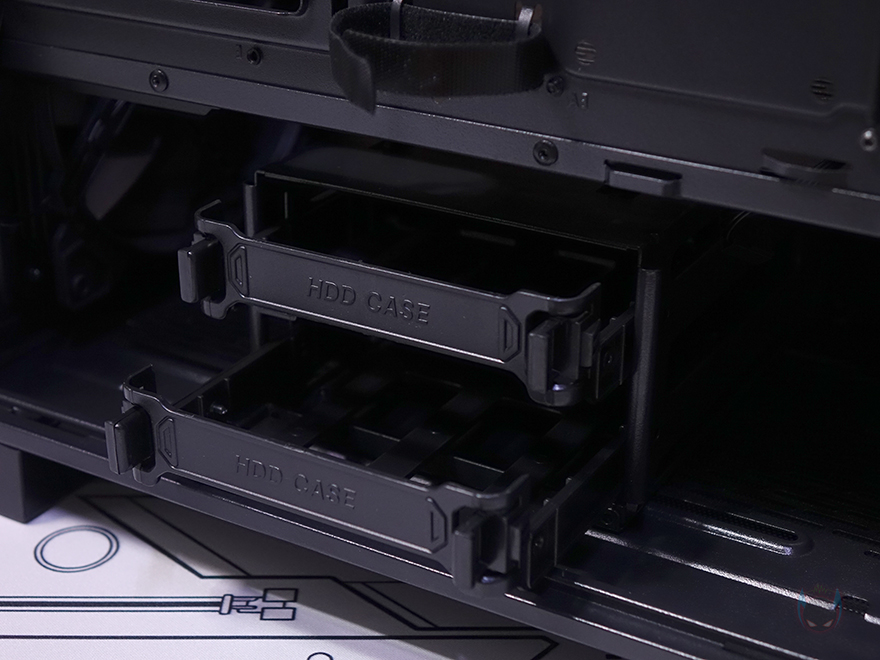 그리고, CPU-cut-Out 바로 아래에는 2개의 2.5인치 저장장치를 장착할 수 있는 가이드가 장착되어 있는데, 참고로 가이드를 장착할 수 있는 자리는 총 3곳으로 사용자가 환경에 따라 위치이동을 시킬 수 있죠. 또한, 가이드 분리도 무나사 방식의 푸쉬-핀으로 쉽게 분리할 수 있으며, 가이드에는 제공되는 나사를 사용해 2.5인치 HDD/SSD를 2개까지 장착할 수 있습니다.