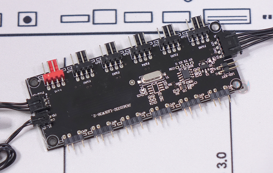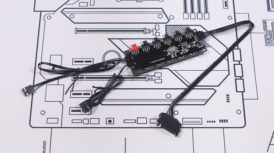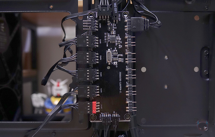그리고, EH1 몬드리안 PC케이스에는 앞서 상단에서 확인했던 LED 버튼을 통한 LED 효과 컨트롤을 위한 허브 장치를 제공해주고 있는데, 허브에는 5V RGB 헤더뿐만 아니라 팬 속도조절도 한 번에 모든 팬을 메인보드와 연결해 조절할 수 있게 팬 커넥터도 함께 갖추고 있습니다. 그래서, 메인보드의 RGB Sync와 연결해서 사용할 수 있고, LED와 팬 모두 각각 6개씩 연결할 수 있죠. 단, 허브 PCB기판 후면에는 양면 테이프로 고정할 수 있게 적용되어 있어서 한 번 부착할 때 위치선정을 고려해야합니다. 끝으로, EH1 몬드리안 PC케이스에 사용된 샤시의 두께를 위치별로 측정한 결과 0.8mm 대인것을 확인할 수 있어서 0.8T 샤시가 사용되었음을 짐작할 수 있죠.