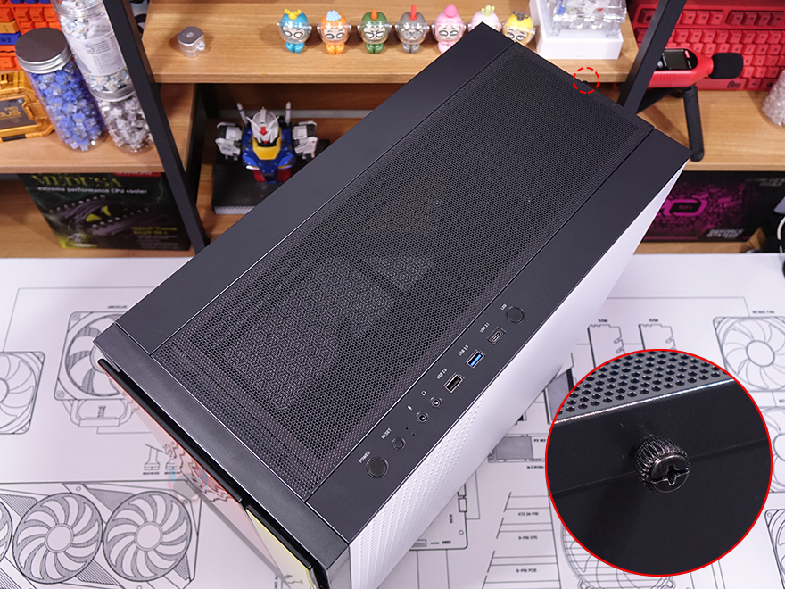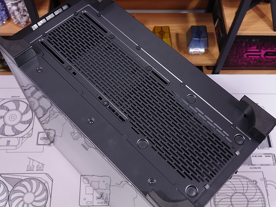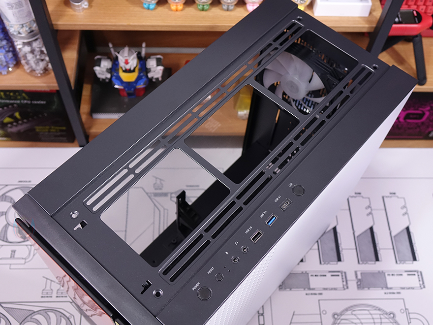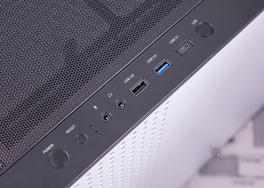 EH1 몬드리안 PC케이스 상단에는 가운데 영역을 기준으로 널찍하게 메쉬 디자인을 적용하고 있는데, 후면에 손나사를 풀면 메쉬 디자인부분의 패널을 분리할 수 있습니다. 패널은 분리하면 상단에도 쿨링시스템을 갖출 수 있게 널찍한 홀과 양쪽으로 긴 나사홀이 처리되어 있죠. 상단 역시 쿨링시스템 지원은 전면과 동일하게 팬으로 장착할 때는 140/120mm 최대 3개, 수랭쿨러시 라디에이터는 360mm까지 장착할 수 있습니다. 또한, 분리된 메쉬 패널 안쪽에는 자석방식의 먼지 필터도 기본 장착되어 있으며, 전면 기준 맨 오른쪽에는 전원과 리셋 버튼을 비롯해 마이크와 오디오 포트, USB 2.0 포트, USB 3.0 포트, USB 3.1 타입C 포트, LED 버튼이 일렬로 배치되어 있죠.