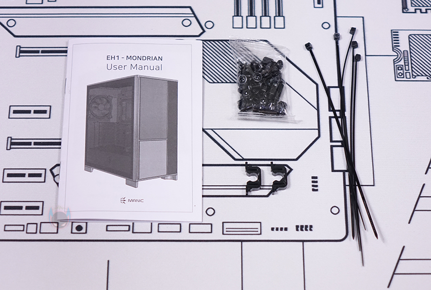 제품박스에는 전면과 후면 그리고 측면까지 마이크로닉스의 로고와 PC케이스 모델명 EH1 몬드리안만 표기를 해놨습니다. 정확히는 서로 맞주는 보는 면끼리 대비되는 색상으로 적용해놨죠. 박스 자체는 상당히 심플해서 특별히 제품의 사양표기도 없고, 바로 박스를 열어보면 PC케이스 부피가 나름 있어서 일반적인 스티로폼 포장재가 아닌 완충효과에 더 좋은 우레탄-폼을 사용했고 폼-파손방지를 위해 겉면에 포장지까지 부착해놨죠. 포장에 상당히 신경을 썼다라는걸 알 수 있습니다. 그리고, PC케이스를 제외한 나머지 부속품들은 별도의 박스 포장으로 제공해주고 있으며, 부속품에는 설명서를 비롯해 부품 장착에 사용되는 각종 나사들, 추가 여분 클램프, 소량의 케이블 타이 제공으로 이루어져 있습니다. 설명서는 그림 이미지를 함께 담고 있어서 소비자가 쉽게 이해하도록 했죠.