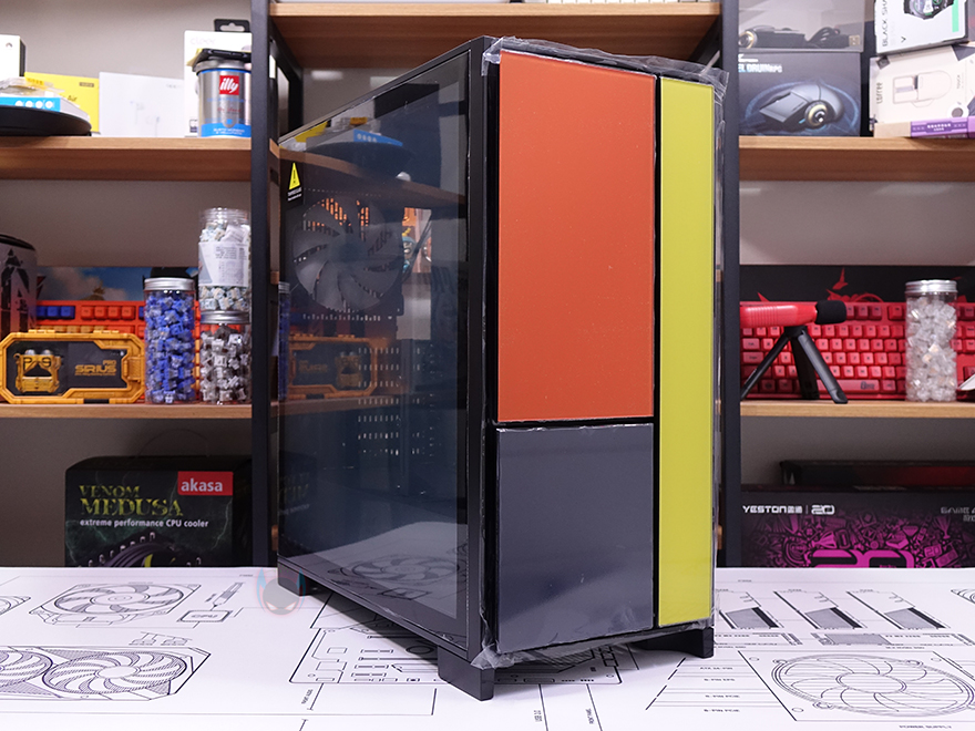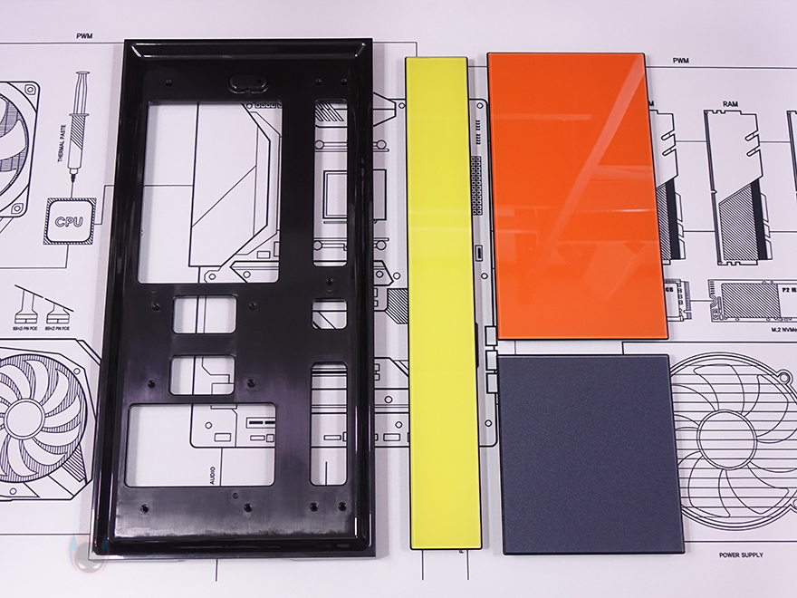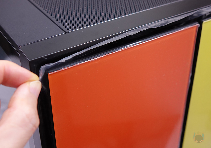 본격적으로 마이크로닉스의 EH1 몬드리안 PC케이스를 살펴보면, 일단 개봉시 전면 베젤에는 보호비닐이 부착되어 있기때문에 모두 제거를 해줘야합니다. 그리고, 색상은 샤시 기준으로 블랙과 화이트 2가지 색상으로 출시되었는데, 전면 베젤의 디자인 정확히는 색상 디자인도 다르게 적용했죠. 물론, 이 제품의 가장 큰 핵심을 전면 베젤에 적용된 3가지 패널 색상으로 이는 화가 피에트 몬드리안의 작품에서 영감을 얻어 적용한건데, 그동안 이 화가의 영감으로 디자인을 적용한 경우는 전자제품이나 가구에서 많이 볼 수 있었지만, PC케이스는 사실상 처음이라 할 수 있습니다. 또한, 3개의 색상 패널 중 윗부분과 맨 오른쪽 패널은 강화유리에 유광이며, 나머지 아래에 1개는 무광으로 처리되었죠. 또한 무광부분에는 펄 효과도 들어가있으며, 3개의 색상 패널은 교체도 가능하기때문에 총 27가지의 색조합으로 표현할 수 있습니다.