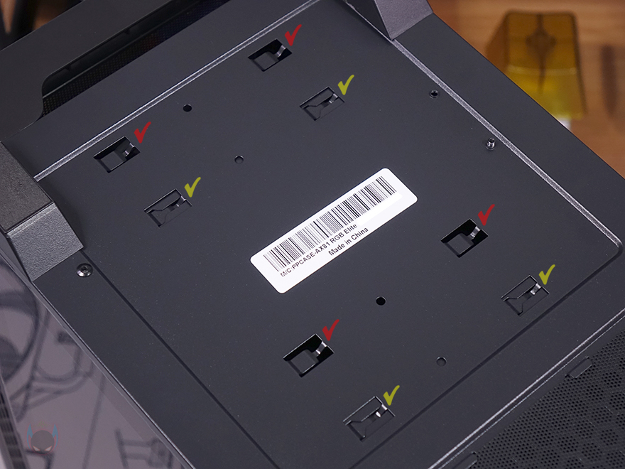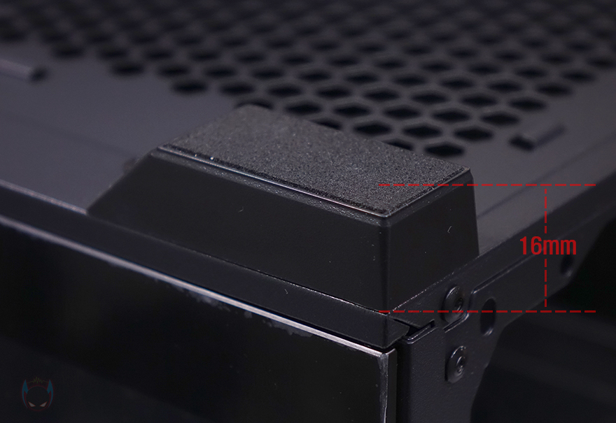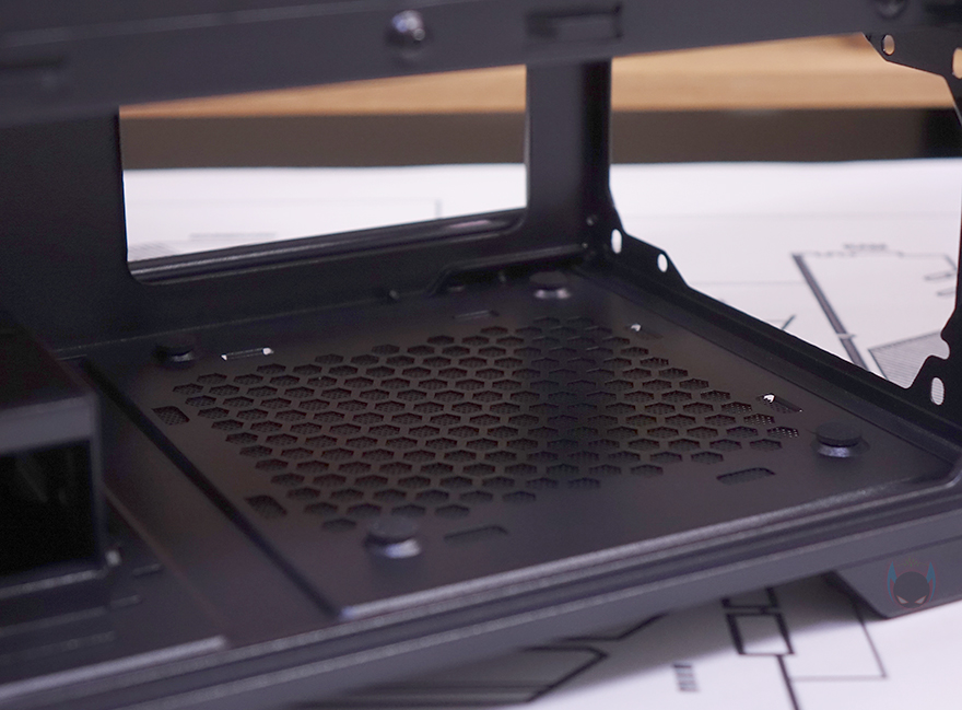외형 끝으로, 케이스 밑바닥을 살펴보면, 받침대는 약 16mm 높이를 가졌으며, 패드도 기본 부착되어 있습니다. 그리고, AX61 Elite와 마찬가지로 AX81 Elite 역시 내부에 장착된 HDD 베이 위치변경을 할 수 있게 2가지 위치고정을 미리 확인할 수 있으며, 파워서플라이 자리에는 분리형 먼지 필터가 장착되어 있는데, 분리하면 벌집모양의 에어홀 처리를 확인할 수 있습니다.