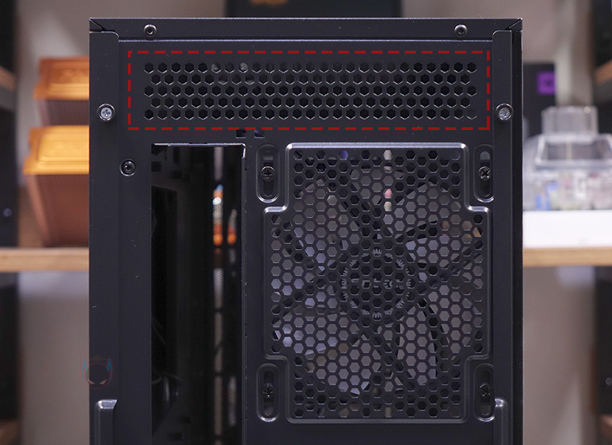 AX81 Elite PC케이스 후면에는 배기역할의 벌집모양 에어홀 처리와 함께 내부에 120mm 팬이 기본 장착된 것을 미리 확인할 수 있으며, 바로 위에도 추가 에어홀 처리가 된 것을 확인할 수 있습니다. 이부분은 뒤에 내부에서도 다시 확인하겠지만, 내부 상단 공간이 AX61 Elite보다 좀 더 넓다라는걸 의미하죠. 그리고, PCI슬롯은 미들타워 기준인 7개를 갖추고 있으며, 맨 아래 파워서플라이 자리는 상하방향 모두 장착이 가능하게 나사홀이 처리되어 있습니다.