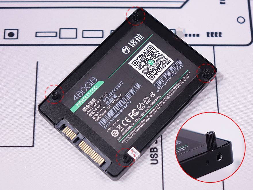 메인보드 트레이 후면을 살펴보면, CPU-cut-Out 바로 아래에는 2.5인치 HDD/SSD를 장착할 수 있는 홀이 처리되어 있는데, 저장장치를 장착하기 위해서는 제공되는 전용 볼트와 고무 패킹을 사용해야합니다. 일단, 볼트를 저장장치에 장착하고, 고무 패킹은 홀부분에 끼운 후, 볼트가 장착된 저장장치를 그대로 고무 패킹에 끼우면 되죠. 별도의 도구없이 장착할 수 있는 무나사 방식입니다. 그리고, 같은 위치에서 맨 아래 하단 공간은 파워서플라이 자리로 기본 받침대에 패드도 기본 부착되어 있죠.