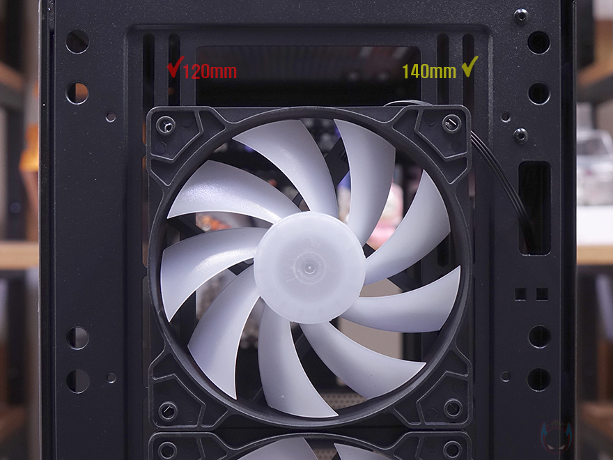 그리고, 하단 파워서플라이 커버 상단에는 선정리 홀과 에어홀 처리 2가지 모두 적용되어 있으며, 추가로 120mm 팬을 2개 장착할 수 있게 나사홀도 처리되어 있죠. 또한, 맨 앞부분에는 수랭쿨러시 라디에이터 장착을 위한 큼지막한 홀처리로 공간도 확보하고 있습니다. 내부 후면에는 외부에서 간접적으로 확인했던 배기역할의 120mm 팬을 다시 확인할 수 있는데, 전면 팬과 마찬가지로 RGB 팬이며, 그 아래 PCI슬롯 가이드는 모두 일회용으로 처리되어 있습니다.