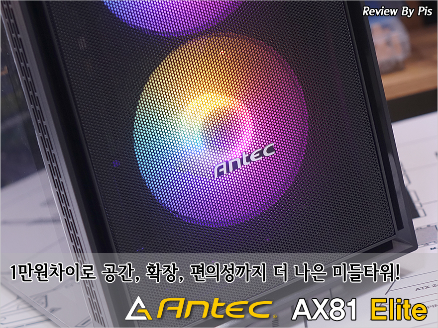 요즘 PC케이스 시장은 그야말로 가성비 춘추시대라 불리만큼 가격대별로 가성비 제품들이 많이 나오고 있죠. 특히, 소비자들이 가장 많이 선택하는 4~5만원대 PC케이스가 가장 치열한데, 왠만한 제품에선 이제 PC 트렌드인 RGB 요소를 PC케이스에서는 RGB 팬을 기본으로 제공해주는 경우가 많아졌습니다. 한국시장에서 오랫동안 활동하고 있는 PC 하드웨어 전문업체 안텍(Antec) 역시 보급형부터 고급형까지 가격대별로 다양한 PC케이스를 갖추고 있는데, AX 시리즈는 대표적인 보급형 라인업으로 앞서 AX61 Elite(https://piscomu.com/4353)를 만나봤듯이 기본 팬을 모두 RGB 팬으로 제공해주고 있습니다. 물론, AX61 Elite 같은경우에는 저렴한 모델에다가 강화유리 패널도 요즘은 보기드물어진 모서리 나사방식으로 약간은 트렌드를 지난 느낌도 있고, 딱 기본 크기의 미들타워로 약간 호환성에 제한도 있었죠. 그래서, 이번 시간에 만나볼 모델은 바로 이 AX61 Elite보다 좀 더 확장성을 키운 PC케이스입니다. 바로, AX81 Elite죠. 그럼, 안텍(Antec)의 AX81 Elite PC케이스를 만나보도록 하죠.