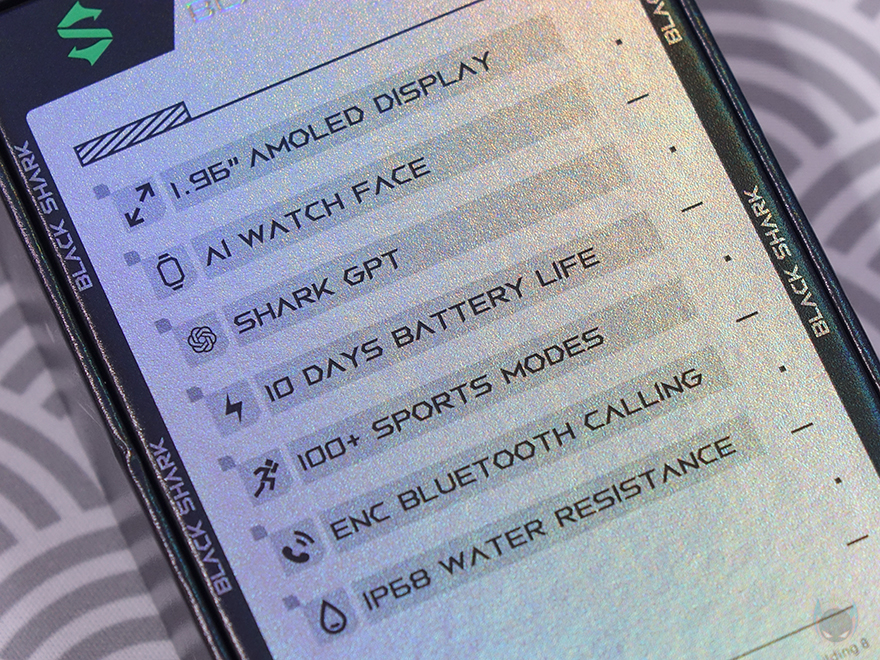 제품박스부터 살펴보면, 스마트워치 제품이기때문에 다른 제품들처럼 긴 박스형태를 가지고 있습니다. 그리고, 박스전체 비닐밀봉처리까지 되어있어서 좀 더 판매제품에 신뢰를 가질 수 있으며, 전반적으로 박스 표면에 빛에 따라 색상이 바뀌는 홀로그램형식으로 처리되어 있죠. 박스 전면에는 모델명과 함께 제품 이미지도 담고 있어서 시계 디자인을 미리 확인할 수 있으며, 아래에 2가지 스트랩(Straps)과 워치페이스, Shark GPT, 화면크기를 주요 특징으로 표기해놨습니다. 물론, 박스 후면에는 이외에도 추가적으로 배터리 사용시간, 100가지이상의 운동모드, 블루투스 전화통화, IP68등급의 방수방진을 주요 특징으로 표기해놨죠.