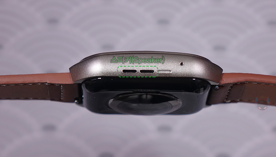 그리고, 시계 왼쪽 측면에는 블루투스 통화시 사용되는 스피커(Speaker)가 적용되어 있으며, 오른쪽 측면에는 크라운 디자인의 다이얼 버튼이 적용되어 있으며, 버튼 위쪽으로는 역시 블루투스 통화시 사용되는 마이크가 적용되어 있습니다. 뒤에서 확인하겠지만, 다이얼버튼은 다른 제품들과 마찬가지로 돌리면서 메뉴나 화면 이동을 할 수 있고, 누르는 버튼 역할도 함께 가지고 있습니다. 그리고, 시계 후면에는 S1 Pro와 마찬가지로 표면 유광처리로 방수가 되도록 했으며, 가운데 볼록한 부분의 테두리부분은 전용 충전기와 접촉되는 충전영역이며, 가운데 중심부에는 센서들이 적용되어 있죠. 참고로 심박수 측정 등을 위한 센서는 적용되어 있지만, GPS는 미적용입니다.