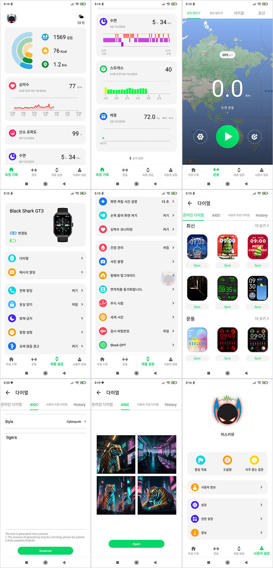 끝으로, 블랙샤크 GT3 스마트워치에 사용되는 블랙샤크의 공용 웨어러블 어플 Shark Wear를 살펴보면, 메뉴는 크게 측정기록, 운동, 제품설정, 사용자설정으로 구분되며, 측정기록에는 심박수, 산소포화도, 수면, 스트레스, 체중 모니터링 기록을 보여줍니다. 당연히 기록순서는 사용자가 변경할 수 있으며, 역시 아쉬운 점은 산소포화도(SpO2) 측정이 24시간 모니터링 미지원이라 수동적으로 기록을 남겨야합니다. 이밖에 운동기록은 다른 스마트워치에서 보여주는 기록이랑 별차이가 없으며, 제품설정에는 앞서 GT3 스마트워치 기기에 내장된 기능들을 설정하는 부분으로 눈에 띄는 기능 중 하나는 바로 워치페이스(Watch Face) 기능으로 AI 인공지능으로 단어만 입력하면 단어에 맞는 워치페이스 배경 화면을 보여주는 AIGC 기능이 있습니다. 대단한 기능이 아닐 수 있지만, 사용자가 직접 커스텀할 수 있는 워치페이스 기능이 있기때문에 이 기능을 활용할때 배경이미지 구하기가 좀 더 수월해지는 편의성이 있습니다.