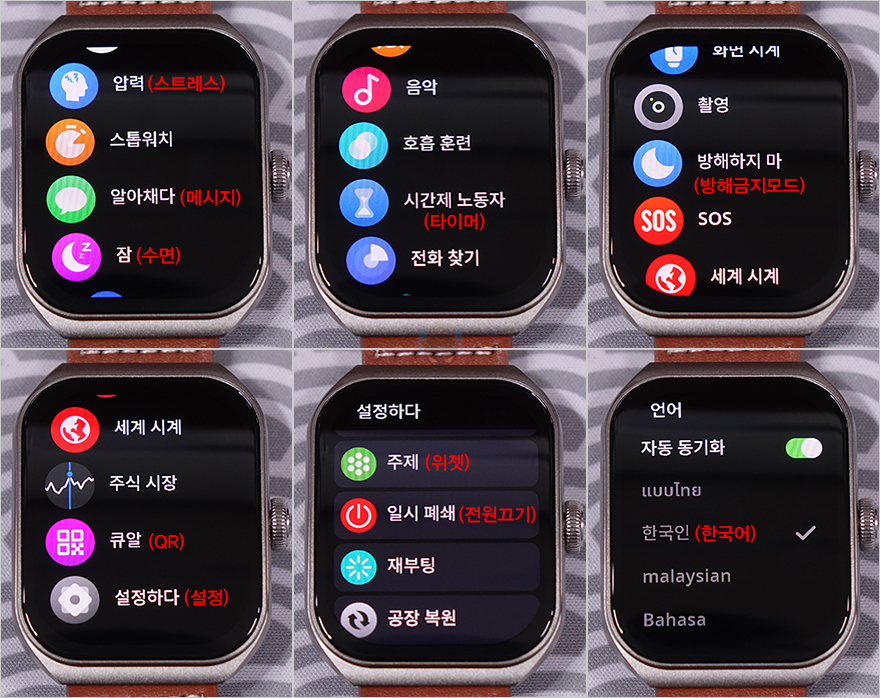그럼, 메뉴들을 잠깐 살펴보면, 가장 먼저 통화기능이 있는데, 블랙샤크 GT3는 먼저 만났던 S1 Pro나 샤오미의 최신 스마트워치 제품들과 마찬가지로 블루투스 통화 기능을 가지고 있습니다. 수신뿐만 아니라 직접 전호를 입력해서 발신까지 가능하죠. 그리고, 운동모드 같은경우에는 기본적으로 10가지 모드를 첫 번째 운동메뉴로 보여주지만, 사용자가 언제든지 순서를 변경하거나 추가할 수 있으며, 커스터마이즈 운동모드로 들어가면 더 다양한 운동모드를 선택할 수 있습니다. 다만, 일부 운동모드의 한국어 표기가 부자연스럽게 표시되고 있어서 완성도가 조금 아쉽습니다.