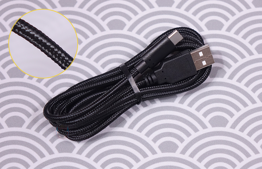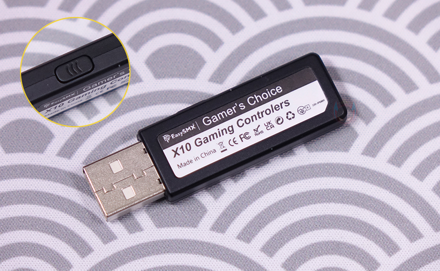 끝으로, X10 컨트롤러를 유선 모드로 사용하거나 배터리 충전할때 사용되는 USB Type-C 케이블은 총 1.5m 길이에 꼬임방지를 위해 전체 슬리빙처리가 되어있으며, USB Type-A to C 인터페이스를 갖추고 있습니다. 또한, 무선 2.4G 사용되는 수신기(receiver)는 작은 사이즈에 역시 USB Type-A 인터페이스를 가졌으며, 측면에 페어링버튼이 적용되어 있죠.
