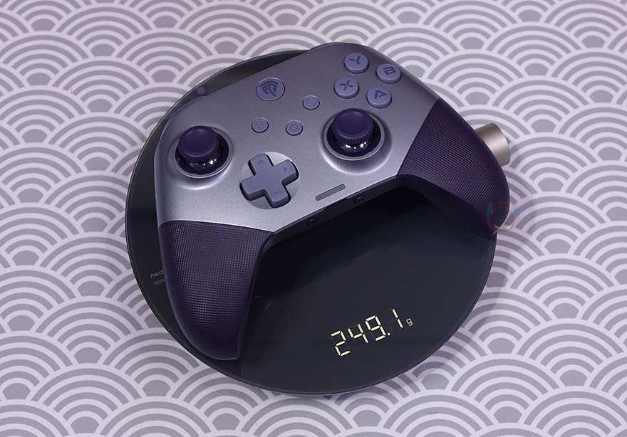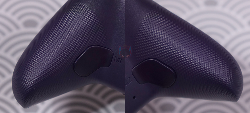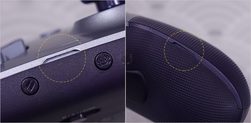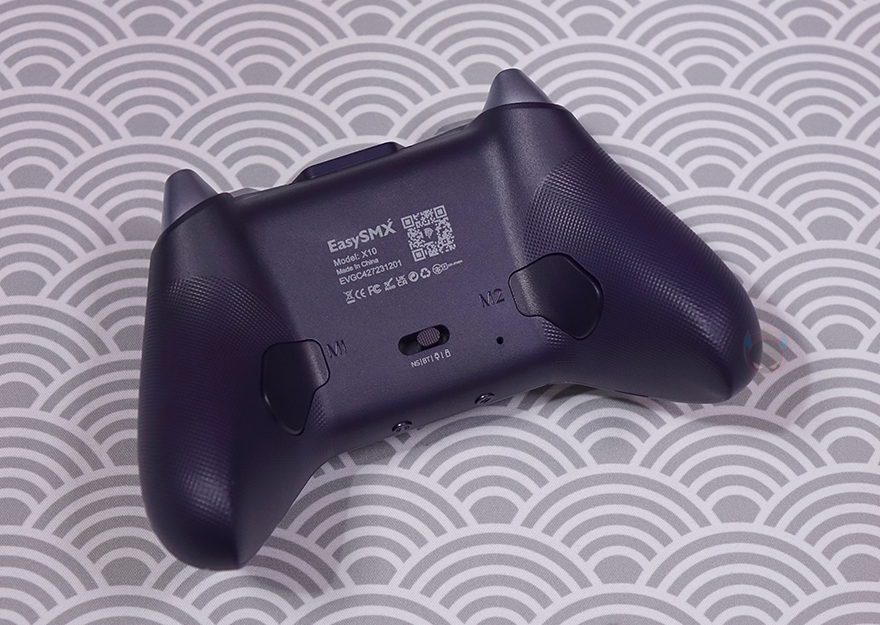X10 컨트롤러 후면에는 양쪽 그립 경계부분에 백버튼(Back button)이 배치되어 있으며, 중앙에는 유선(Wired), 무선 2.4G, 블루투스(Bluetooth), 닌텐도스위치(NS) 연결모드를 선택할 수 있는 스위치가 배치되어 있습니다. 그리고, 약간 아랫쪽에 리셋(Reset) 홀도 적용되어 있죠. 또한, 양쪽 그립부분 후면에도 전면과 마찬가지로 그대로 엠보싱 디자인이 적용되어 있습니다.