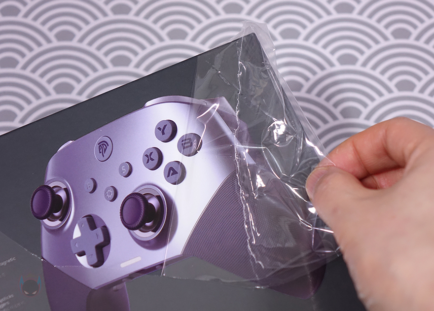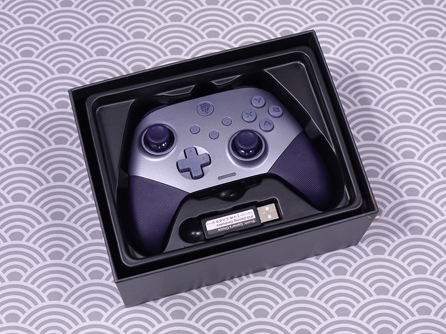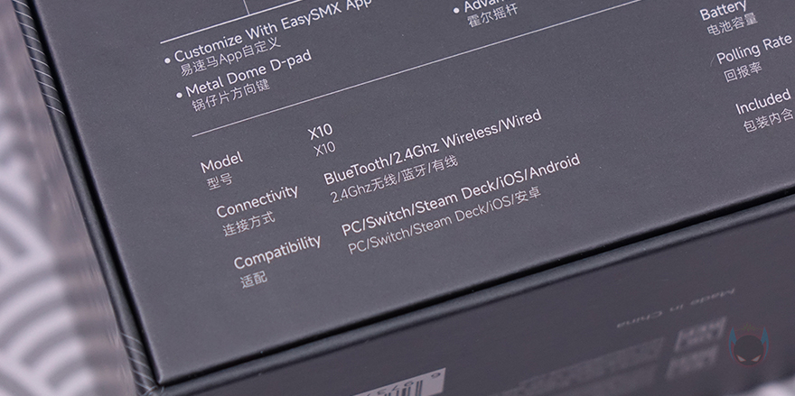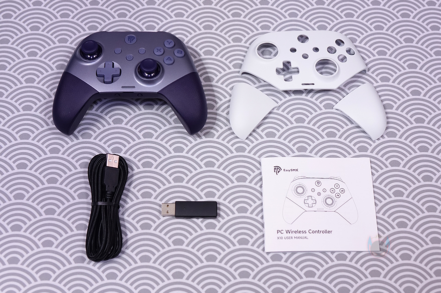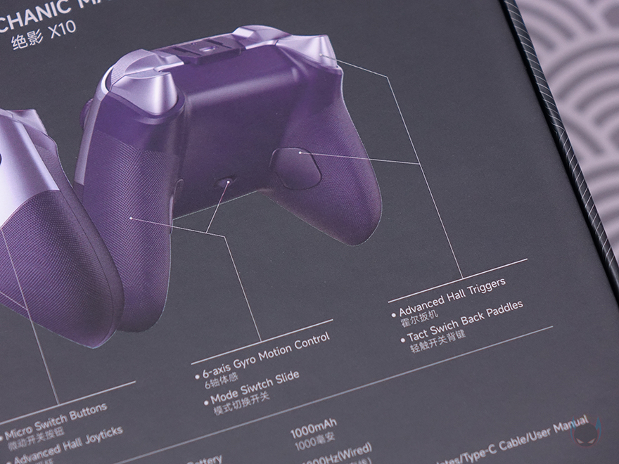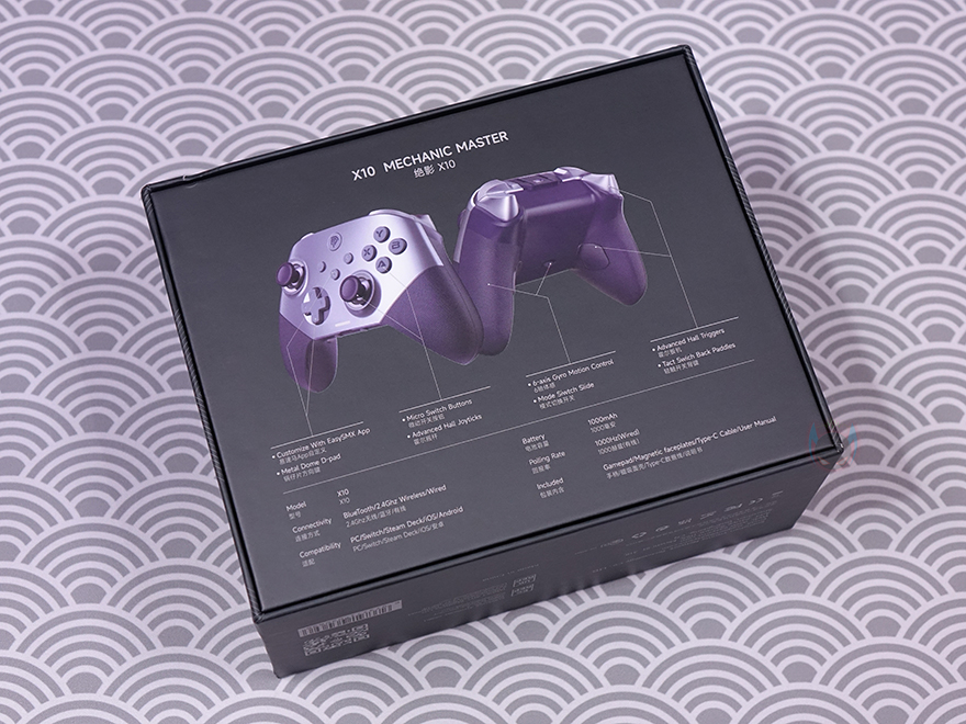 물론, 박스 후면에는 전면에서 확인한 주요 특징들을 제품 이미지와 함께 위치별로 더 상세하게 표기해놔서 좀 더 쉽게 이해가 됩니다. 또한, 추가로 메탈 소재의 돔-패드(Dome pad), 6축 자이로 모션, 백버튼에 대한 표기도 확인할 수 있죠. 이밖에도 아래은 제품의 기본 사양으로 연결모드 지원, 호환성 지원, 배터리 용량, 전송제어속도, 제품구성품목록 표기도 확인할 수 있으며, 박스를 열어보면 바로 제품 크기 맞춤틀에 포장된 X10 컨트롤러를 확인할 수 있고, 아래에는 나머지 구성품들이 수납되어 있습니다. 제품 구성은 X10 컨트롤러, 교체용 마그네틱 페이스플레이트, USB Type-C 케이블, 무선 2.4G 수신기(Receiver), 제품설명서로 이루어져 있습니다.