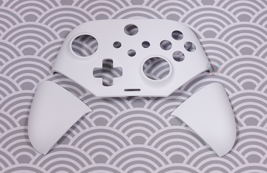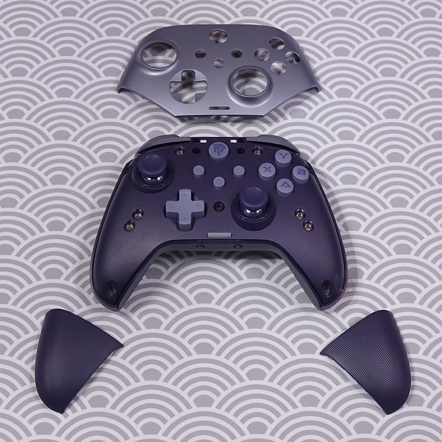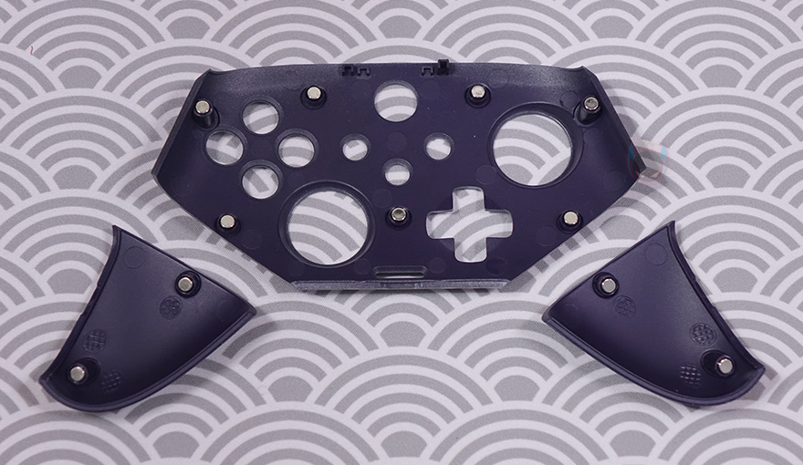 앞에서 몇 번 언급했듯이 X10 컨트롤러의 특징 중 하나는 바로 상판 교체 그러니깐 페이스플레이트(Faceplates)를 교체할 수 있다라는 점으로 양쪽 그립 안쪽과 가운데 플레이트 아랫쪽에 각각 분리할 수 있는 작은 홈이 있으며 이부분으로 기본 장착된 페이스플레이트들을 쉽게 분리할 수 있습니다. 그리고, 자석방식(magnetic)으로 장착되는 구조라 분리된 페이스플레이트 안쪽을 보면 자석들이 적용된 것도 확인할 수 있죠. 그래서, 기본 색상이 마음에 들지않거나 심플한 색상으로 바꾸고 싶다면 언제든지 함께 제공되는 화이트색상(White color) 페이스플레이트로 교체하면 됩니다.